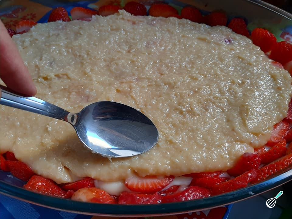 Cubra os morangos com o recheio preparado anteriormente, espalhando com o auxílio de uma colher.
