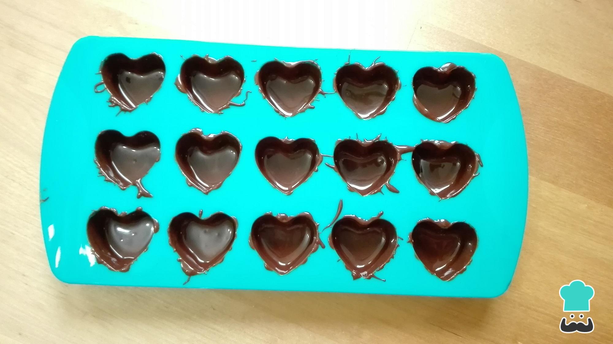 Parta o chocolate em pedaços e derreta em banho-maria ou no microondas. Depois distribua um pouco pelas forminhas e espalhe, para formar a casquinha de chocolate. Reserve na geladeira por 10 minutos.