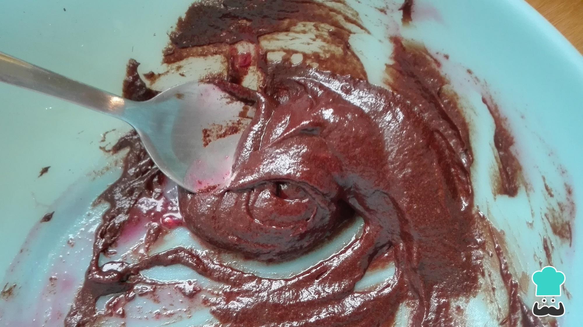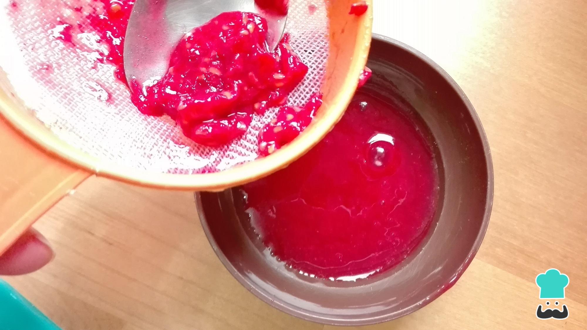 Enquanto isso, esmague as framboesas com um garfo, e peneire, pressionando com uma colher, para aproveitar somente o suco.