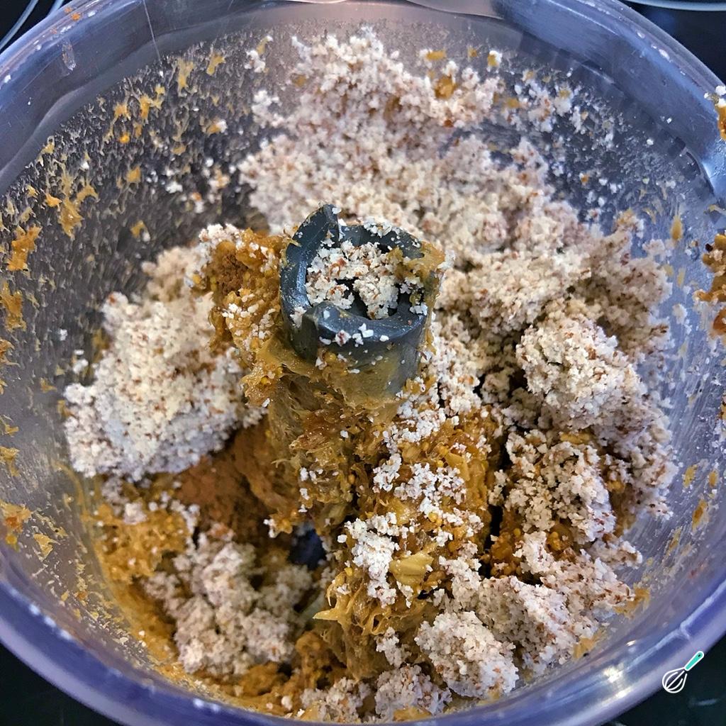 Adicione o resíduo de amêndoa e bata até virar uma pasta que não grude nas mãos.