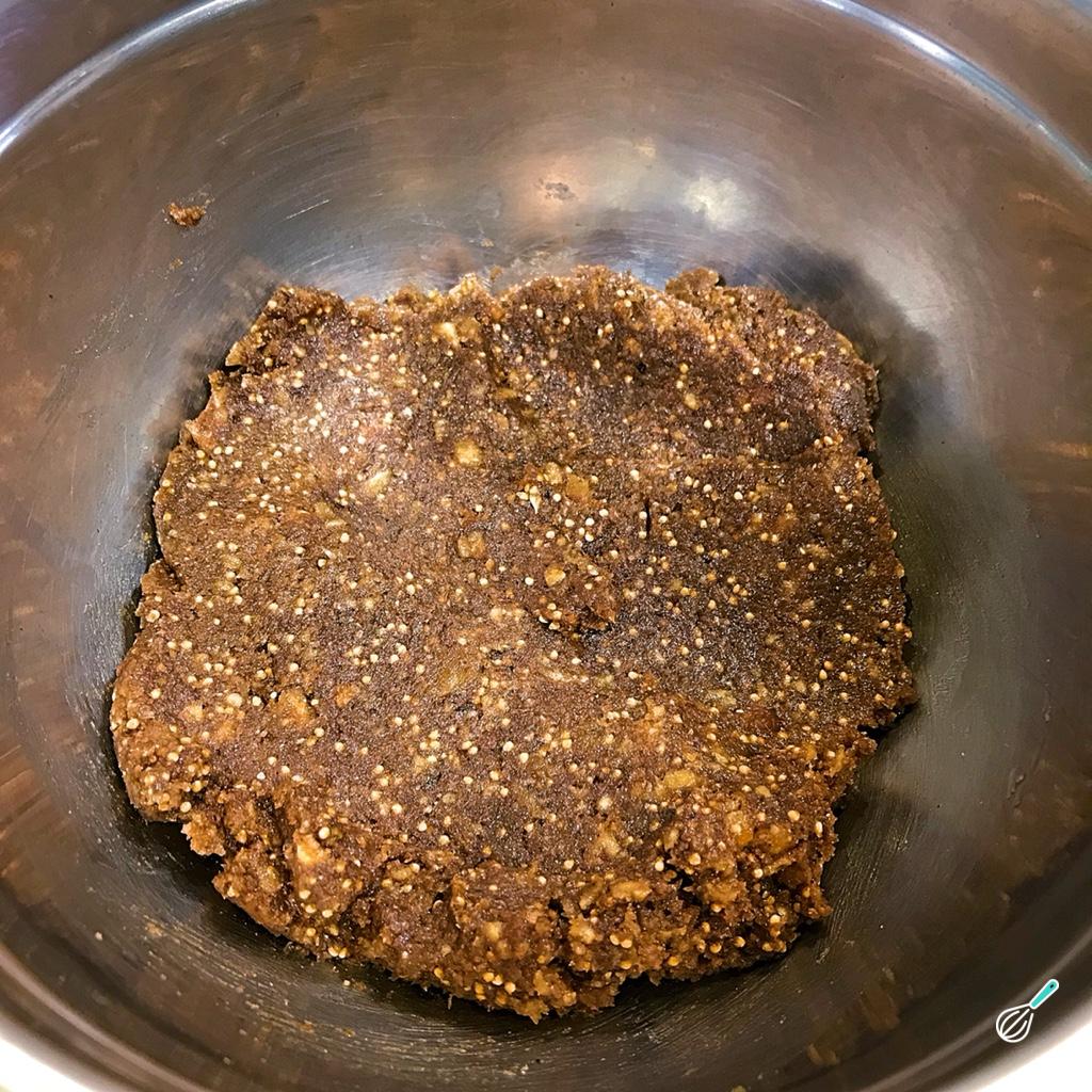 A massa do bombom vegano de figo tem que ficar nesse ponto igual ao da foto, ligeiramente grudenta mas bem consistente.