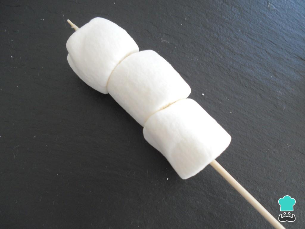 O primeiro passo para fazer estes bombons de boneco de neve é colocar 2 ou 3 cubinhos de marshmallow em cada palito de espeto.