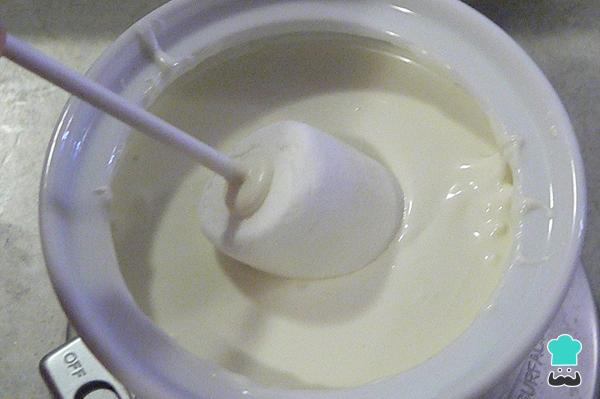 Deixe que o chocolate esfrie um pouco e mergulhe nele os espetos de marshmallow, um de cada vez, envolvendo bem os marshmallow com chocolate.