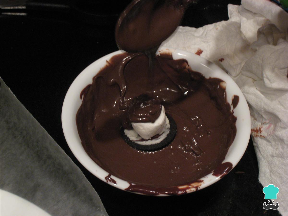 Use o chocolate ao leite para fazer o chapéu destes espetinhos doces: separe o biscoito Oreo ou Negresco, espalhe um pouco de chocolate na metade com o creme e grude aí um cubinho de marshmallow cortado a metade. Depois mergulhe no chocolate, para cobrir bem, grude no topo do espetinho e deixe firmar.