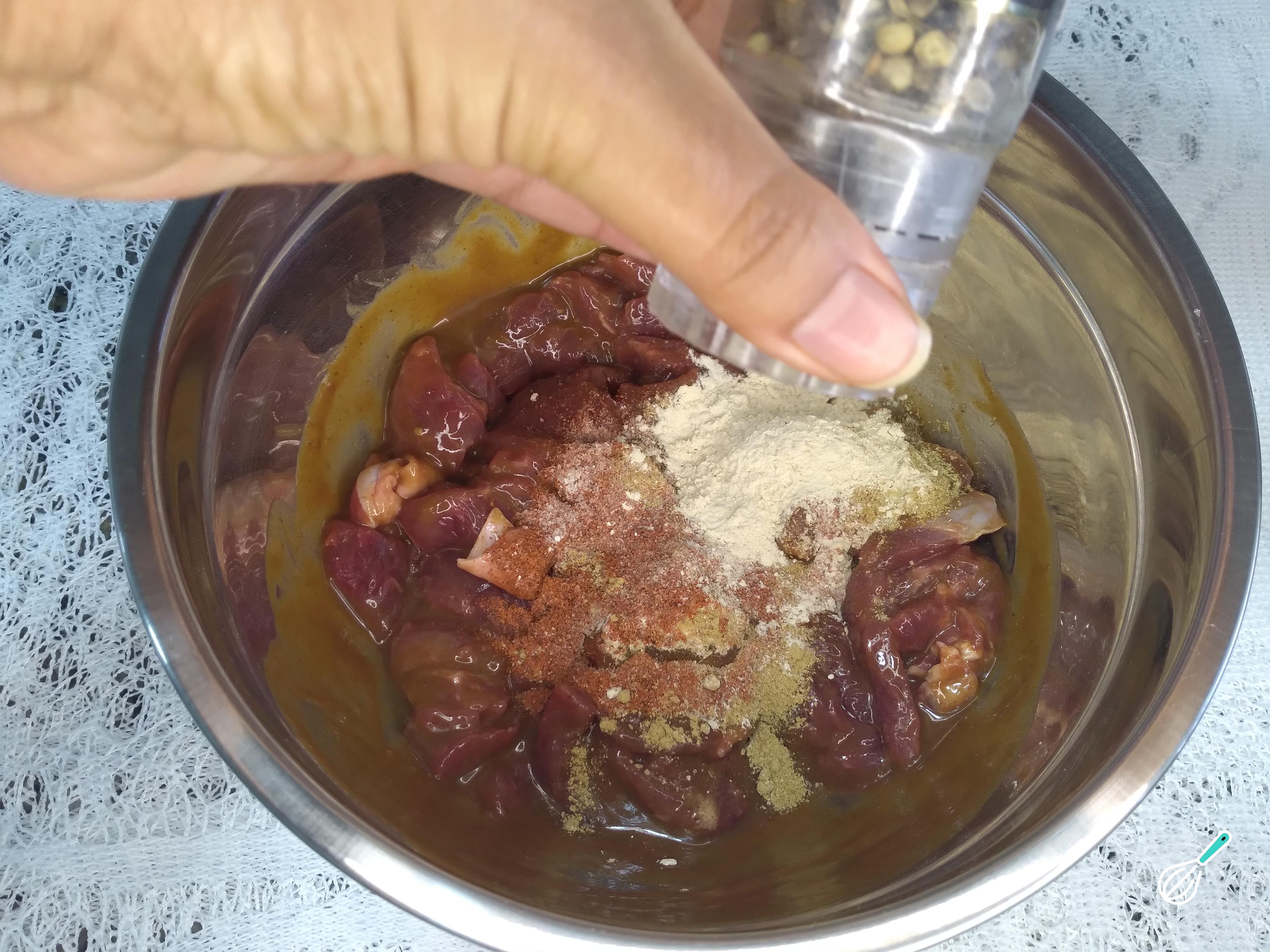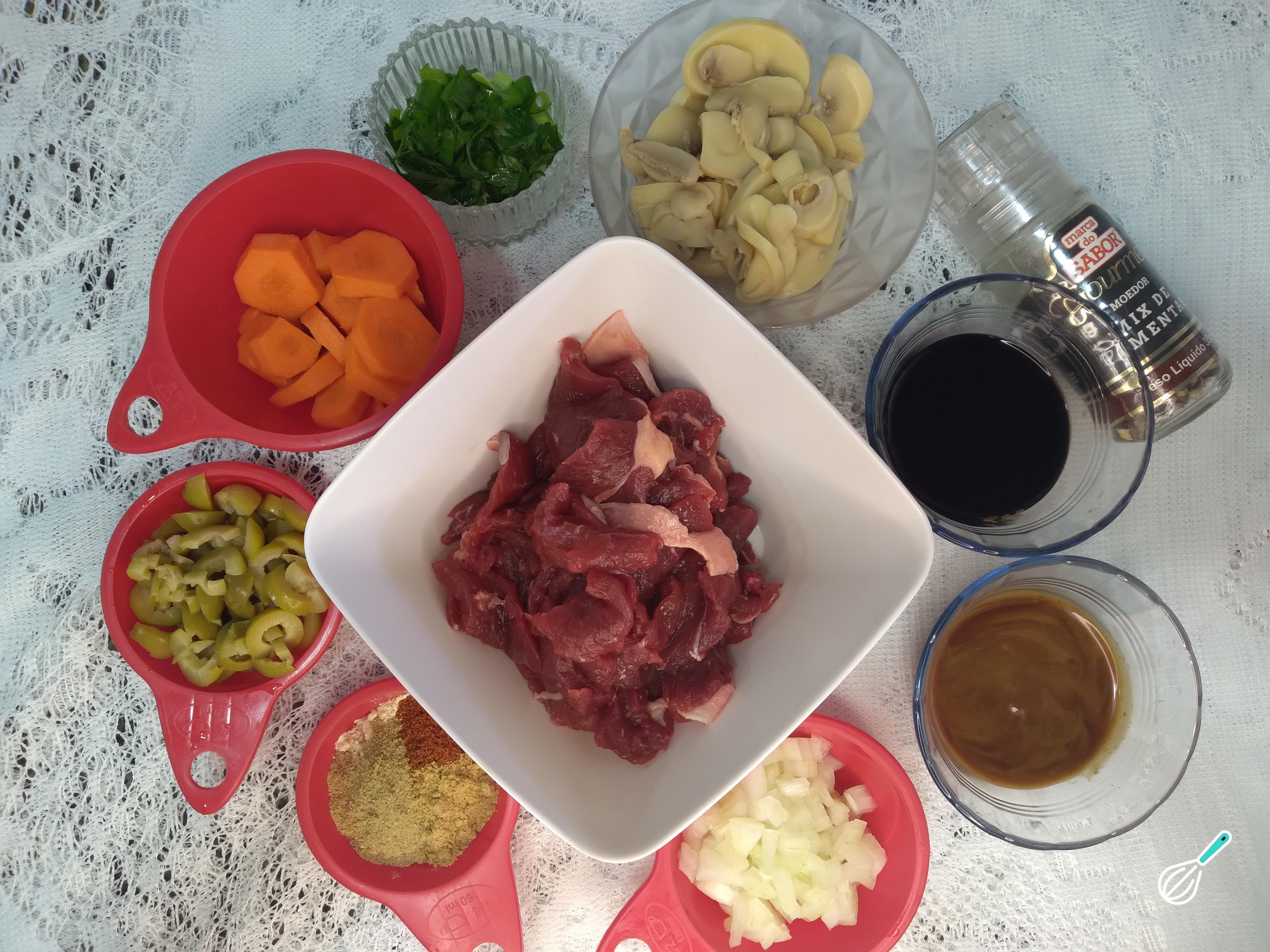 Feito isso, coloque a carne cortada em um bowl. Acrescente sal, os temperos de sua preferência, a mostarda, o molho de carne, a pimenta e o vinho tinto. Coloque a metade do vinho, reserve o restante. Mexa tudo, misturando bem para incorporar os sabores. Leve para geladeira e deixe marinar por no mínimo 4 horas.
