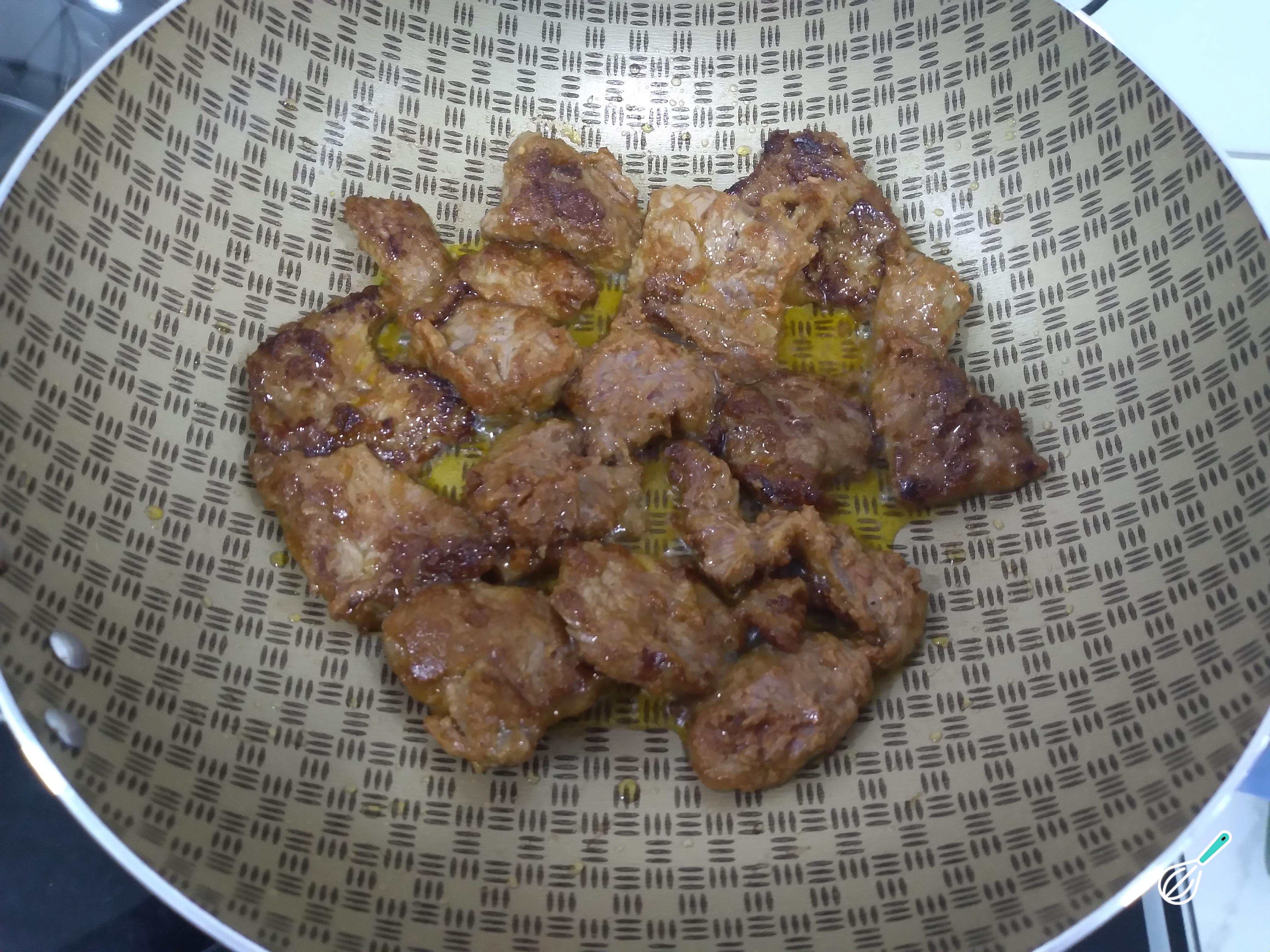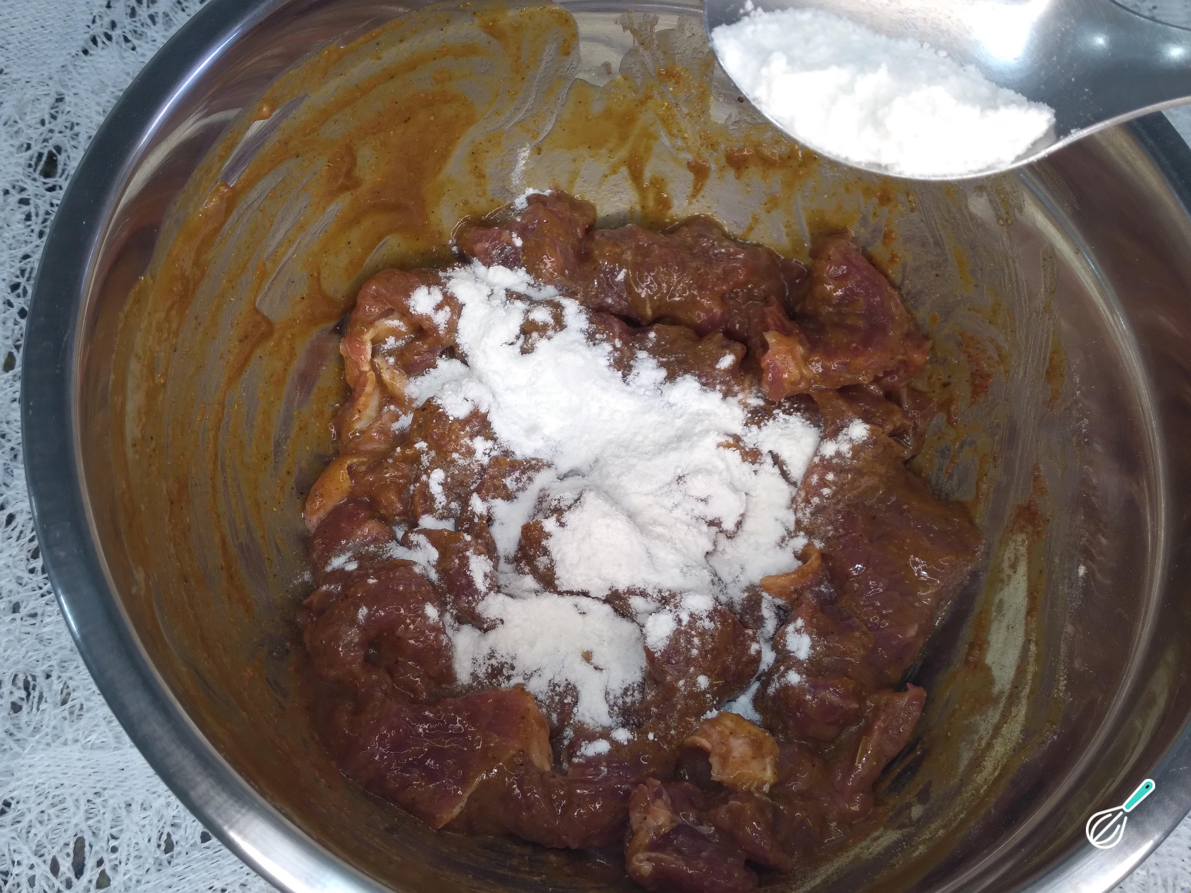 Depois do tempo de pausa para a marinada, retire a carne da geladeira e envolva a carne em 1 colher sopa de farinha de arroz. Misture bem para que fique bem homogêneo. Esta etapa é importante para que a carne fique sequinha e o molho mais encorpado.