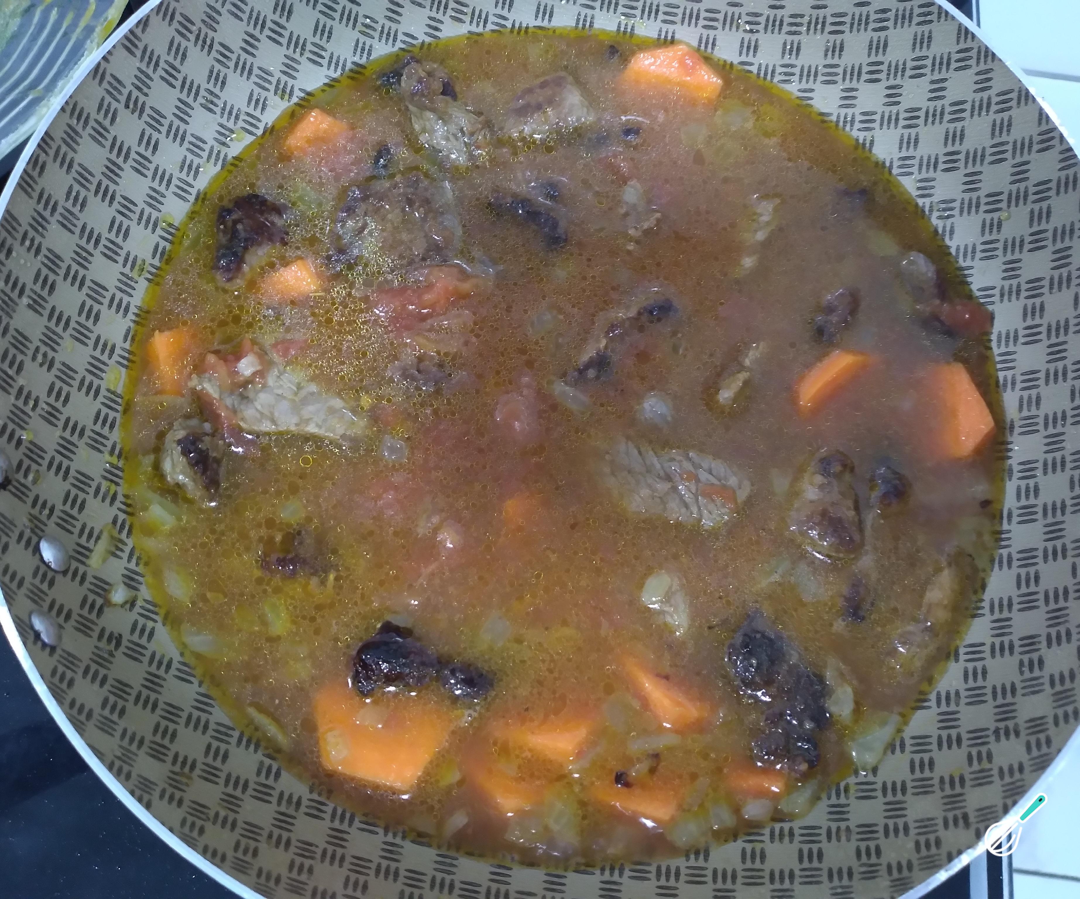 Feito isso, acrescente a carne reservada. Cubra com água e coloque o restante reservado do vinho. Tampe a panela e deixe cozinhar um pouco para incorpar o caldo.