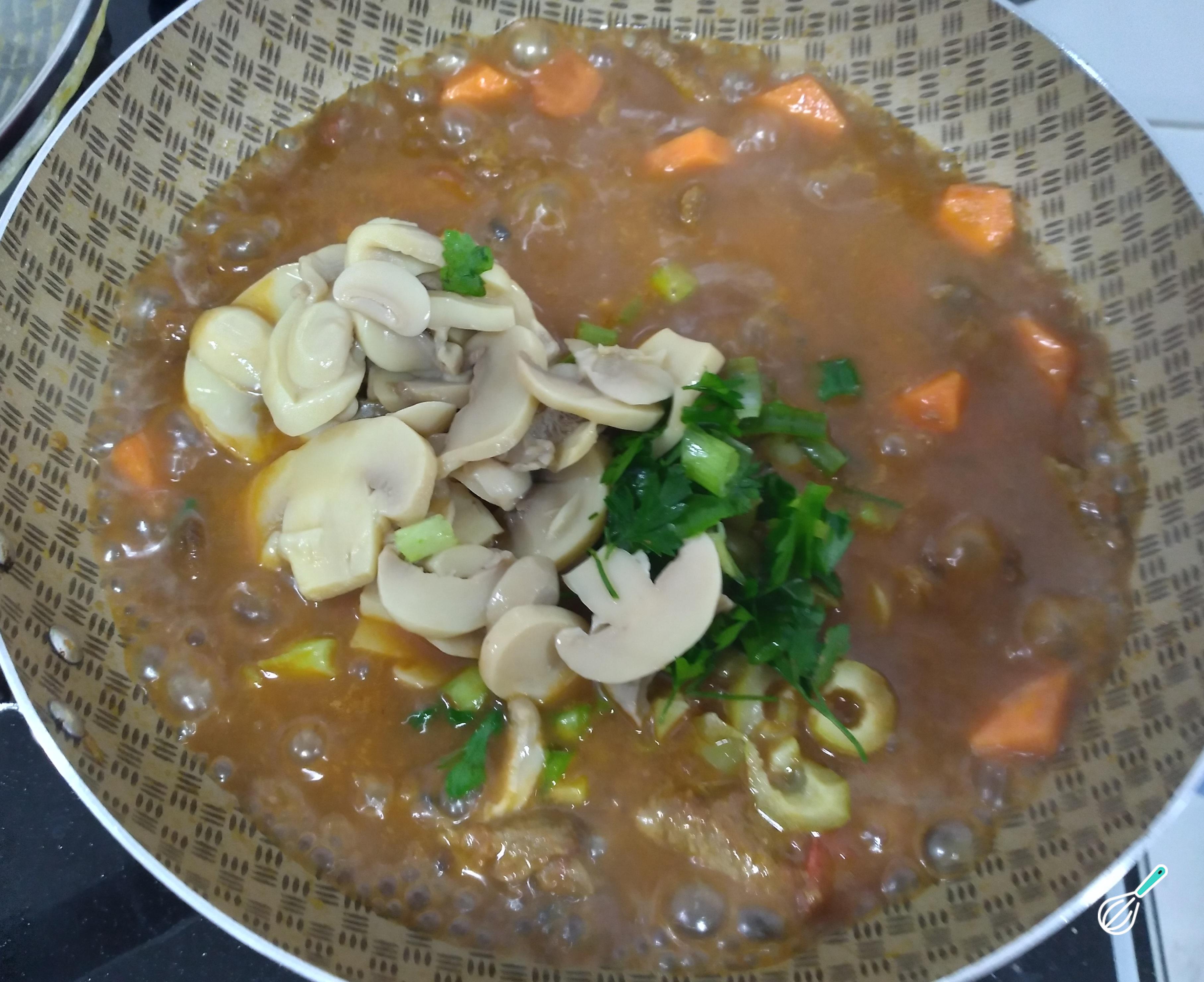 Quando o caldo estiver encorpado, acrescente os champignons, as azeitonas e cebolinha e salsinha. Deixe cozinhar até que água seque um pouco mais e engrosse o molho. Depois de engrossar o molho e misturar bem os ingredientes desligue o fogo. Mantenha o fogo de médio para baixo.