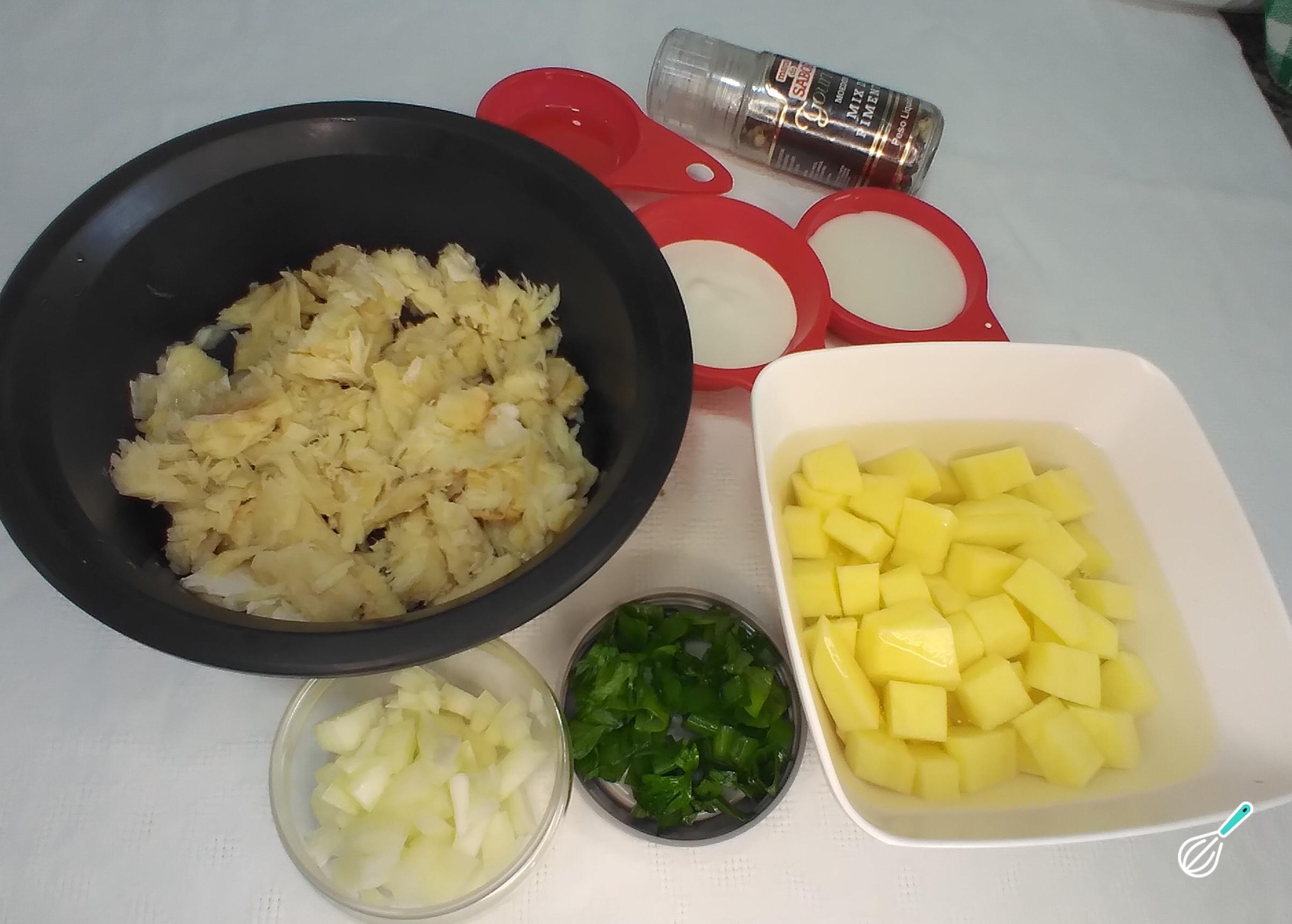 Comece separando os ingredientes para a sua brandade de bacalhau. O bacalhau precisa estar dessalgado e limpo, e precisa estar desfiado para este preparo. Corte as batatas e cubos pequenos, para que cozinhem mais rápido e tenham um cozimento por igual. Corte a cebola também em cubos pequenos e deixe a cebolinha e salsinha cortadas. Separe o leite e o creme de leite.