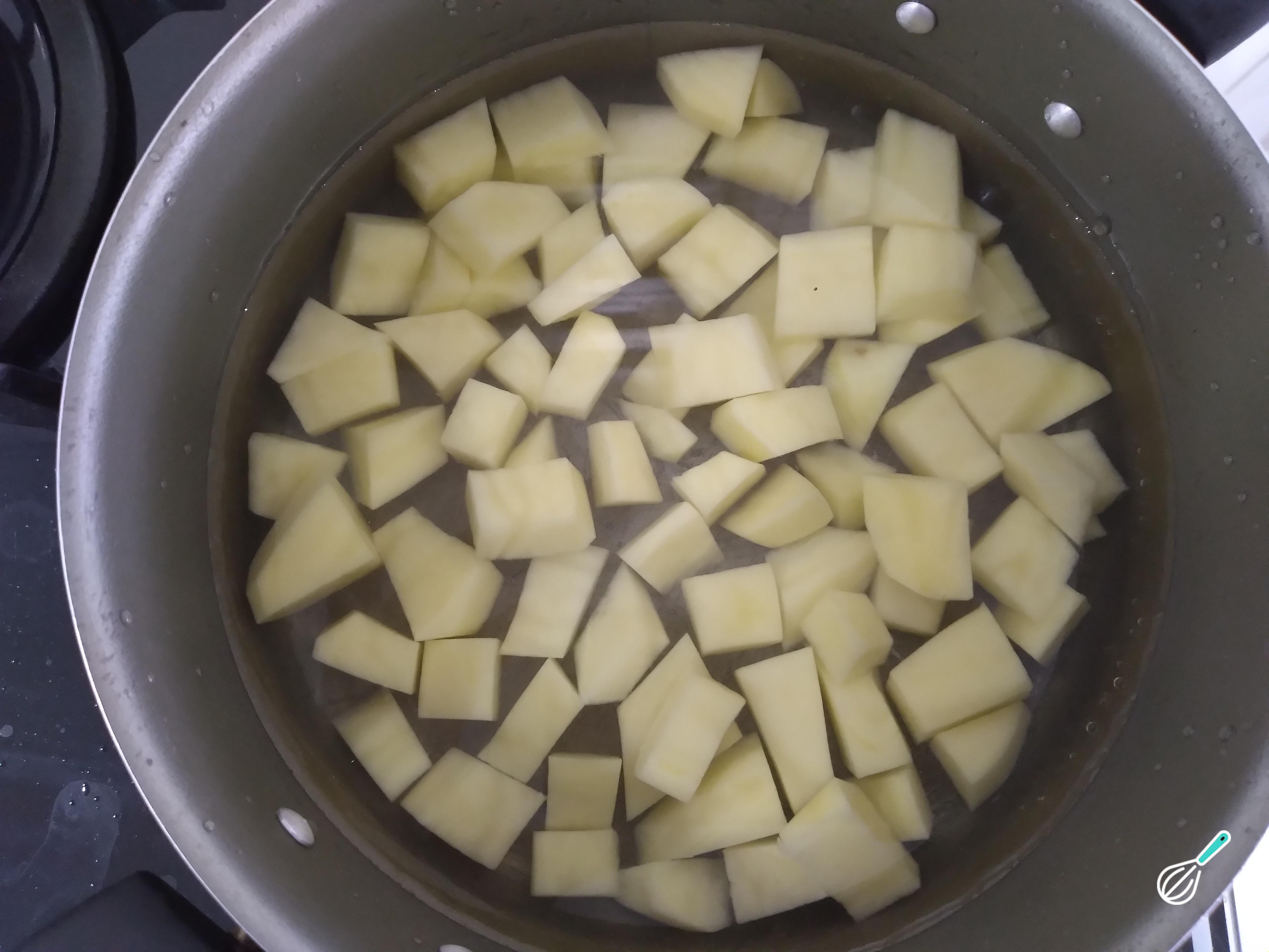 Em fogo médio para alto, coloque uma panela com água e coloque as batatas para cozinhar. Deixe que cozinhem até ficarem macias. Espete o garfo, quando ele entrar com facilidade, estarão cozidas.