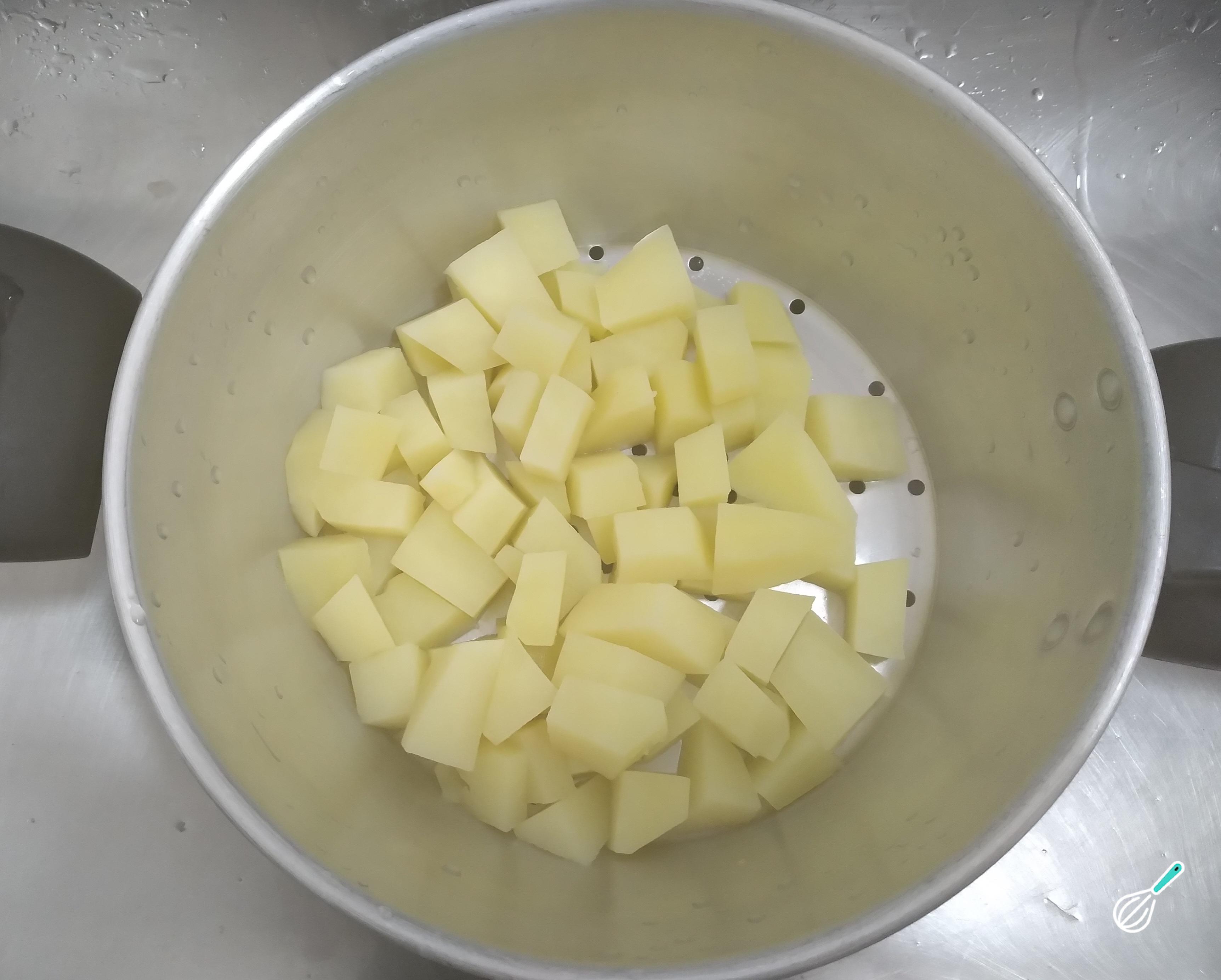 Depois de cozidas escorra as batatas em um escorredor. Deixe que a água do cozimento escorra bem e as batatas fiquem bem sequinhas.