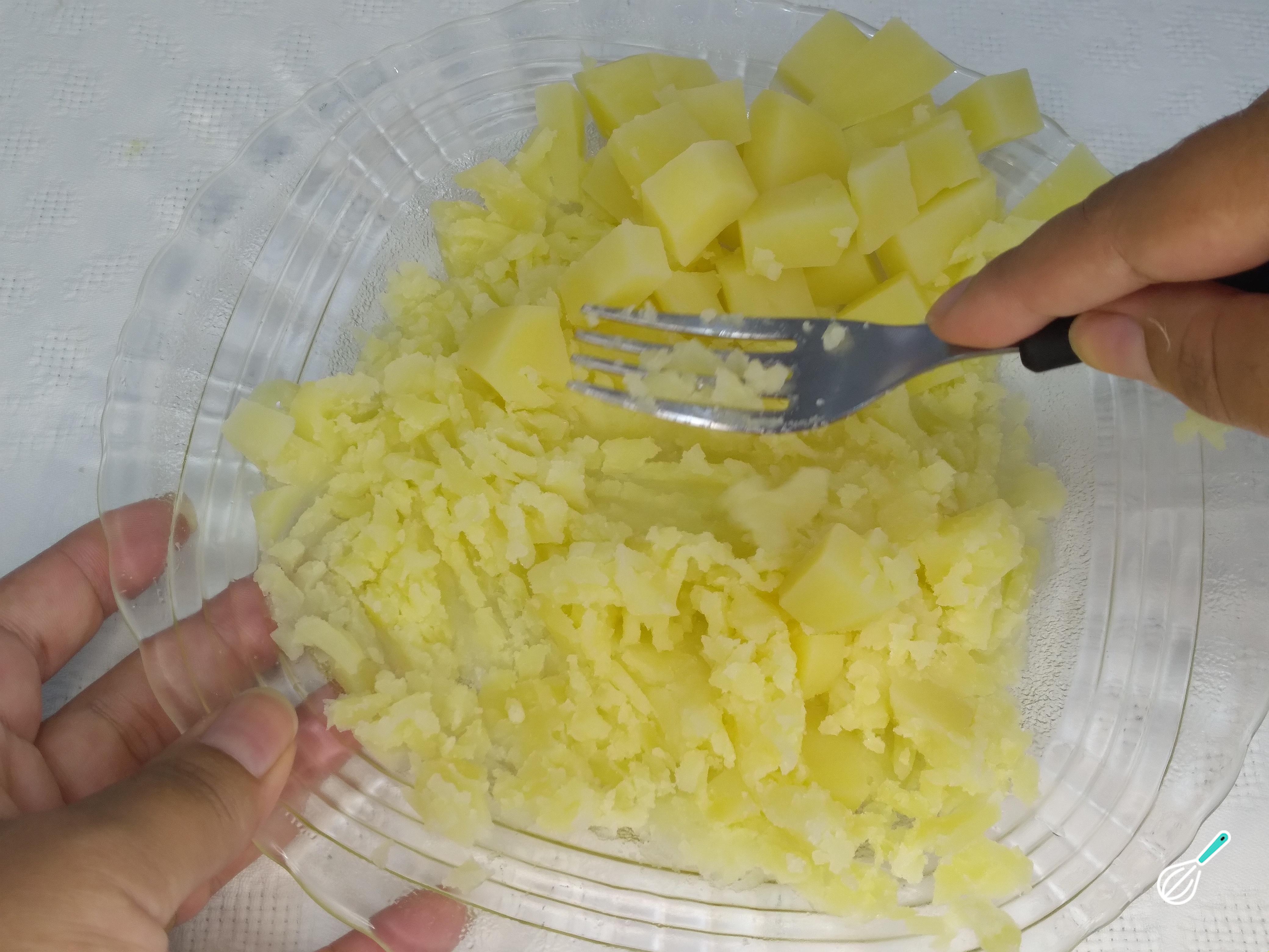 Depois de escorrer a batata, em um prato com o auxílio de um garfo, amasse as batatas e deixe-as bem homogêneas.