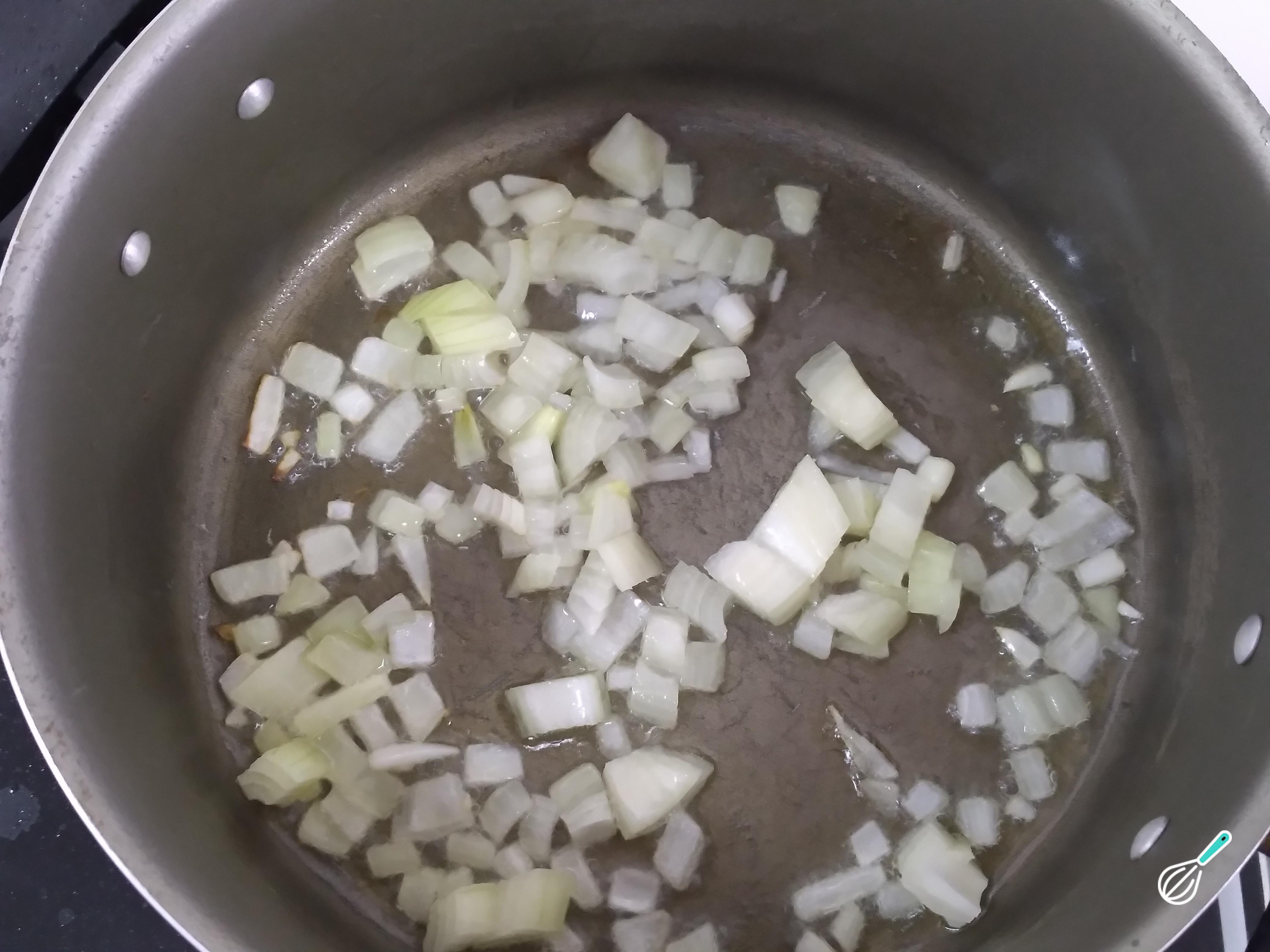 Em uma panela, coloque o azeite e a cebola branca picadinha. Deixe a cebola refogar.