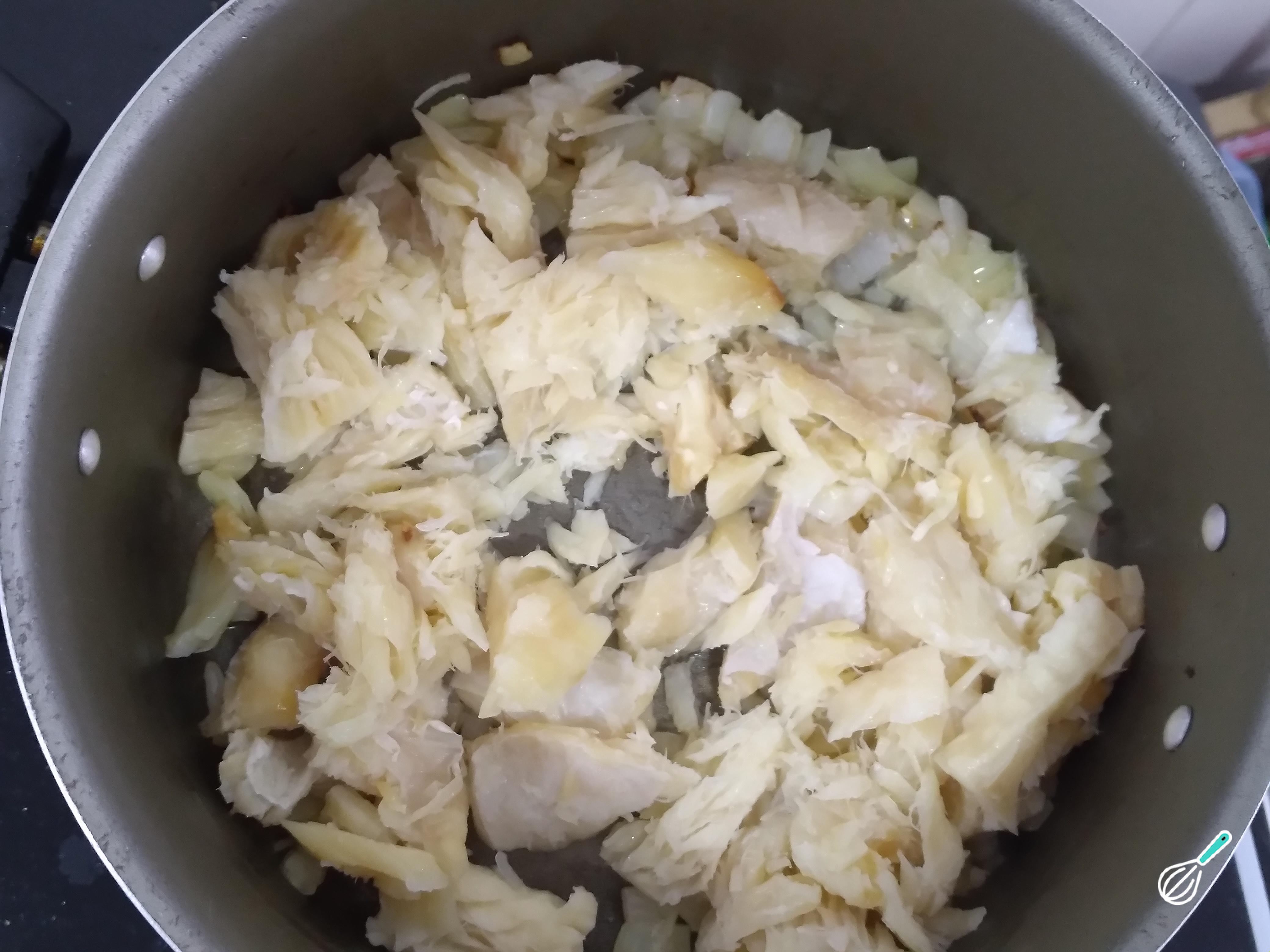 Feito isso, acrescente o bacalhau desfiado e refogue um pouco. Mexa bem para incorporar os sabores. Acrescente o alho e a cebola em pó.
