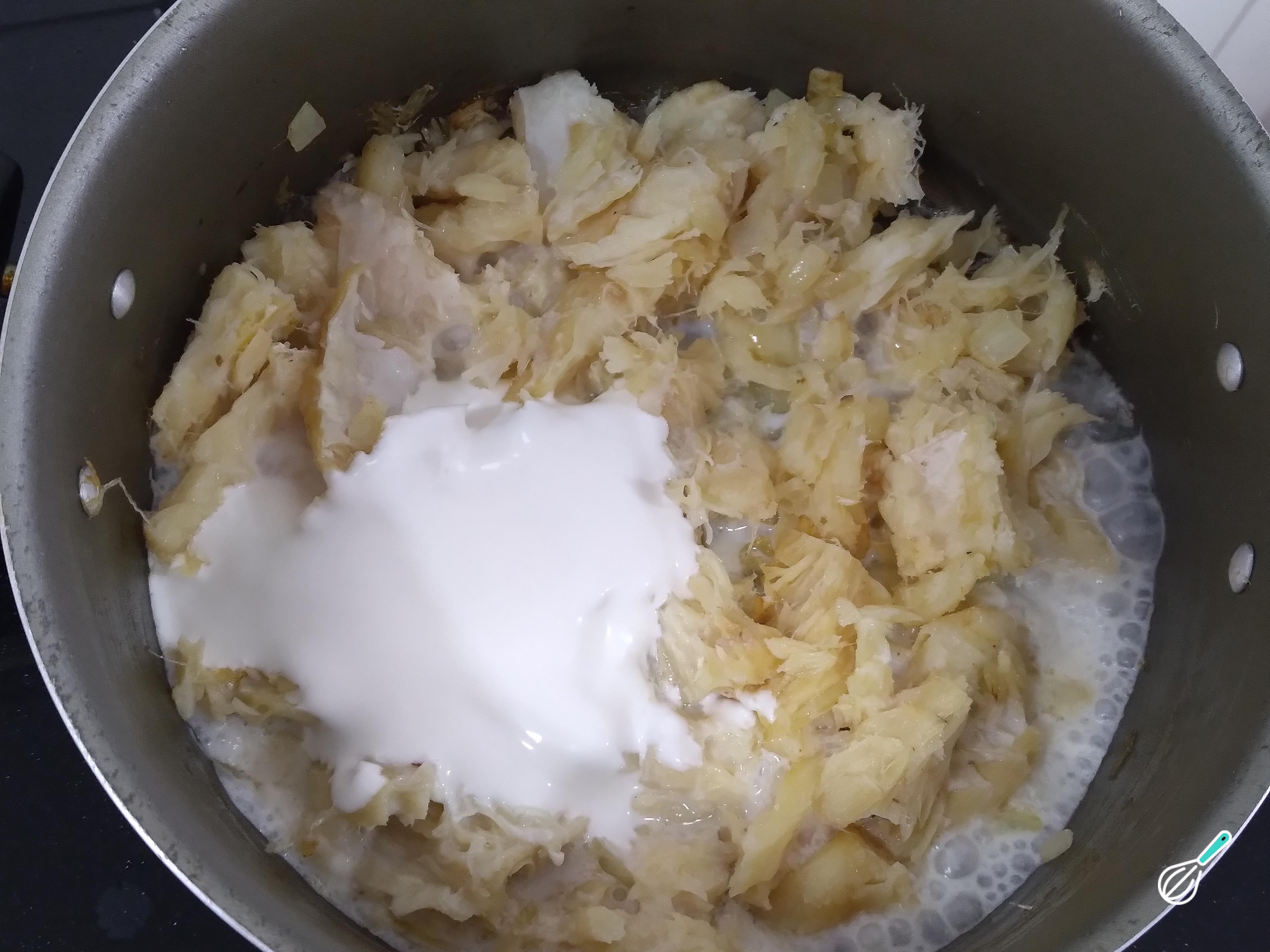 Dica: o ideal é que o bacalhau esteja desfiado. Assim o prato ficará mais bonito.