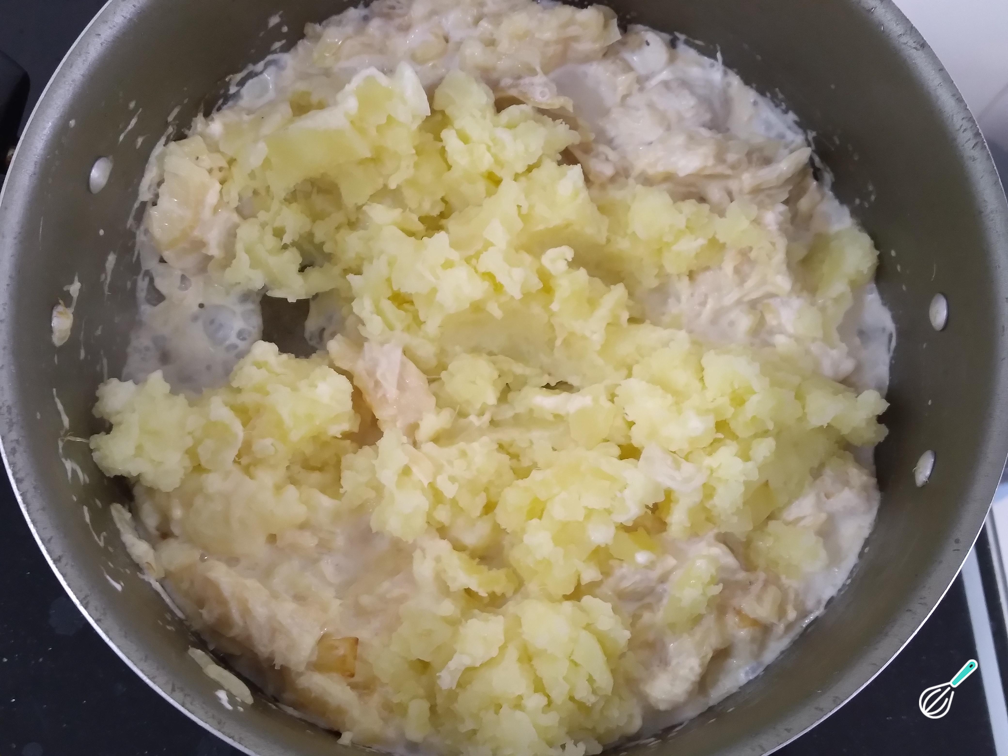 Feito isso acrescente as batatas amassadas. Misture tudo muito bem.