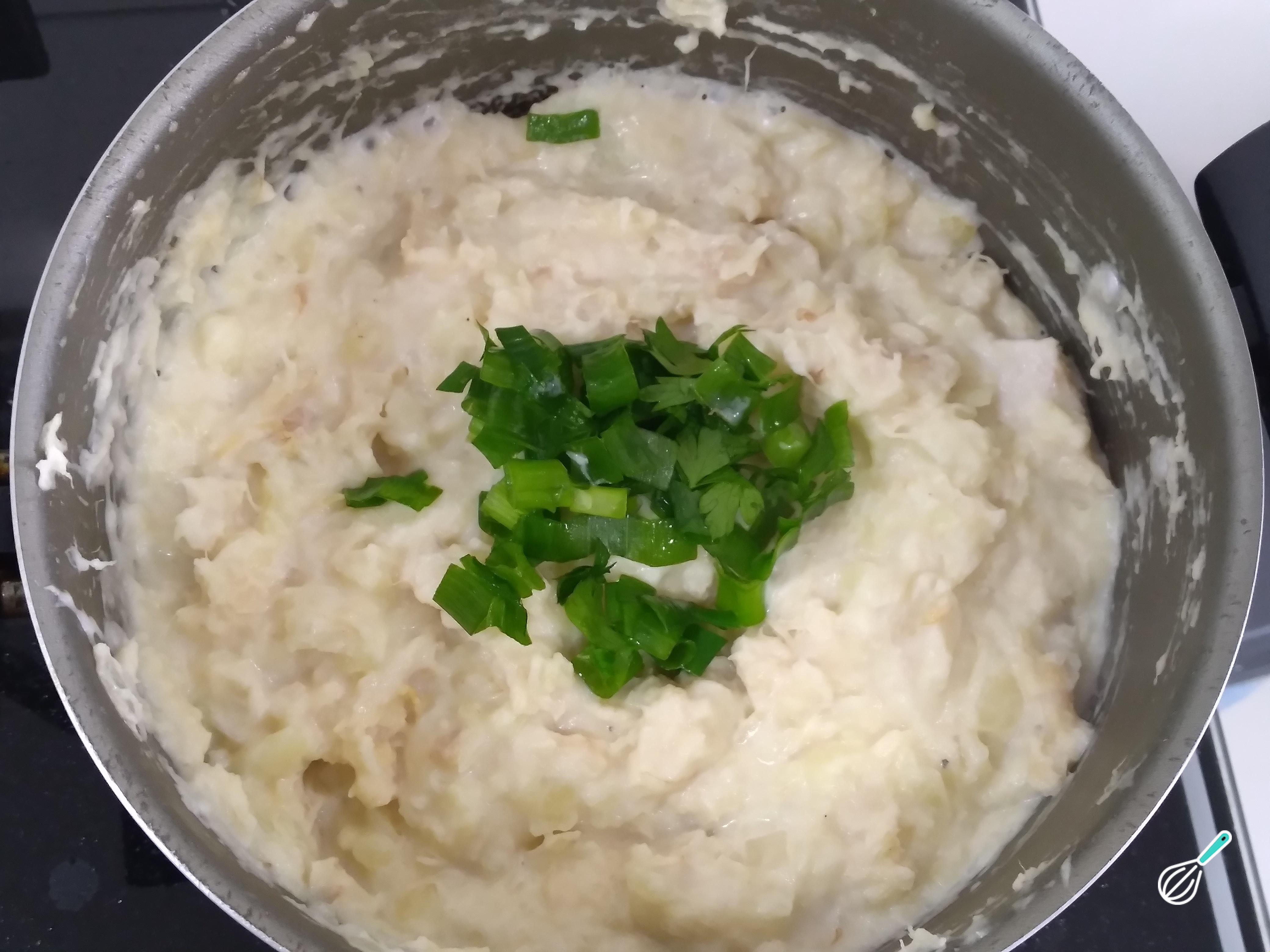 Por último, acrescente a salsinha e cebolinha picadas. Misture tudo muito bem. Prove e, se precisar, acerte o sal.