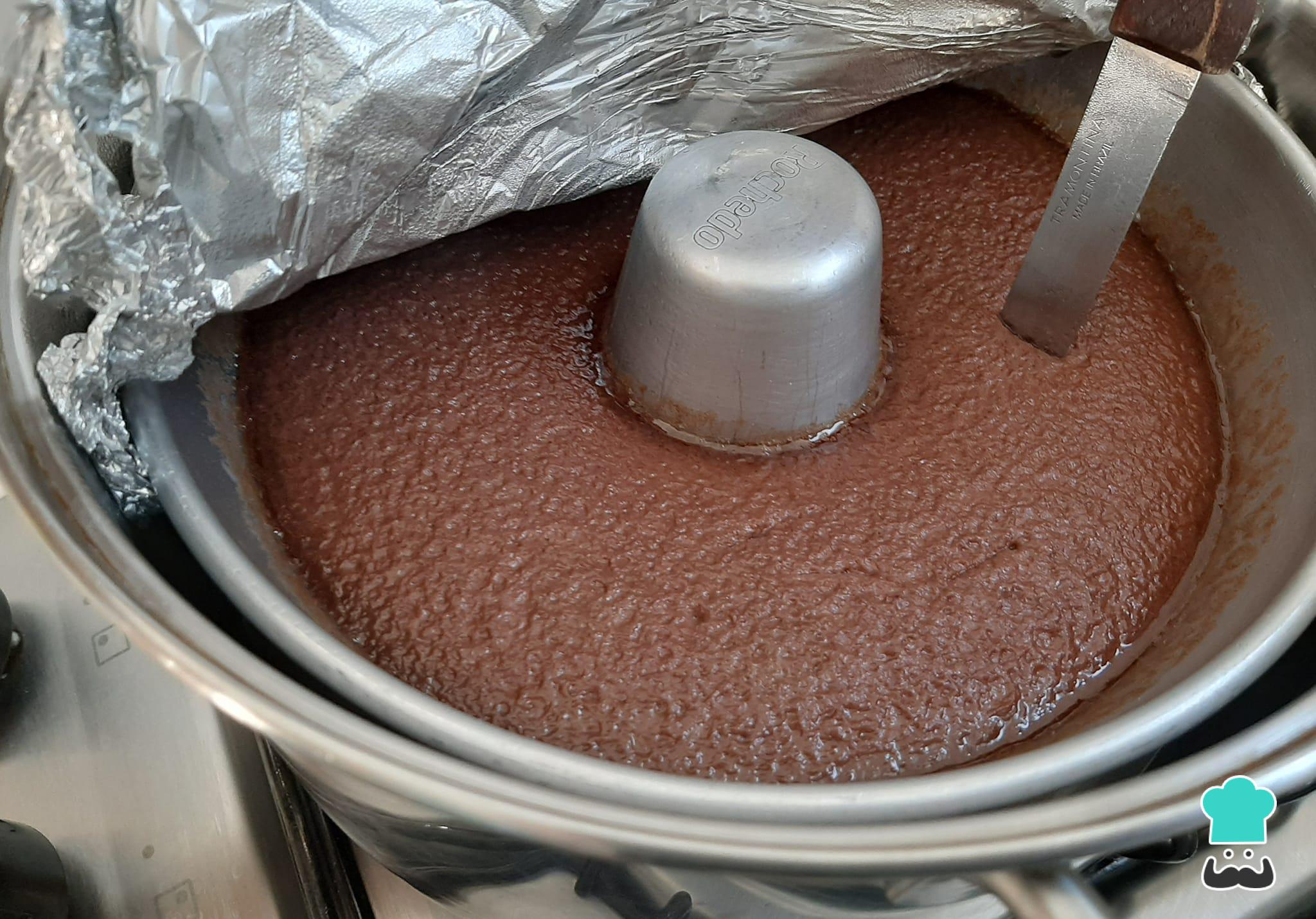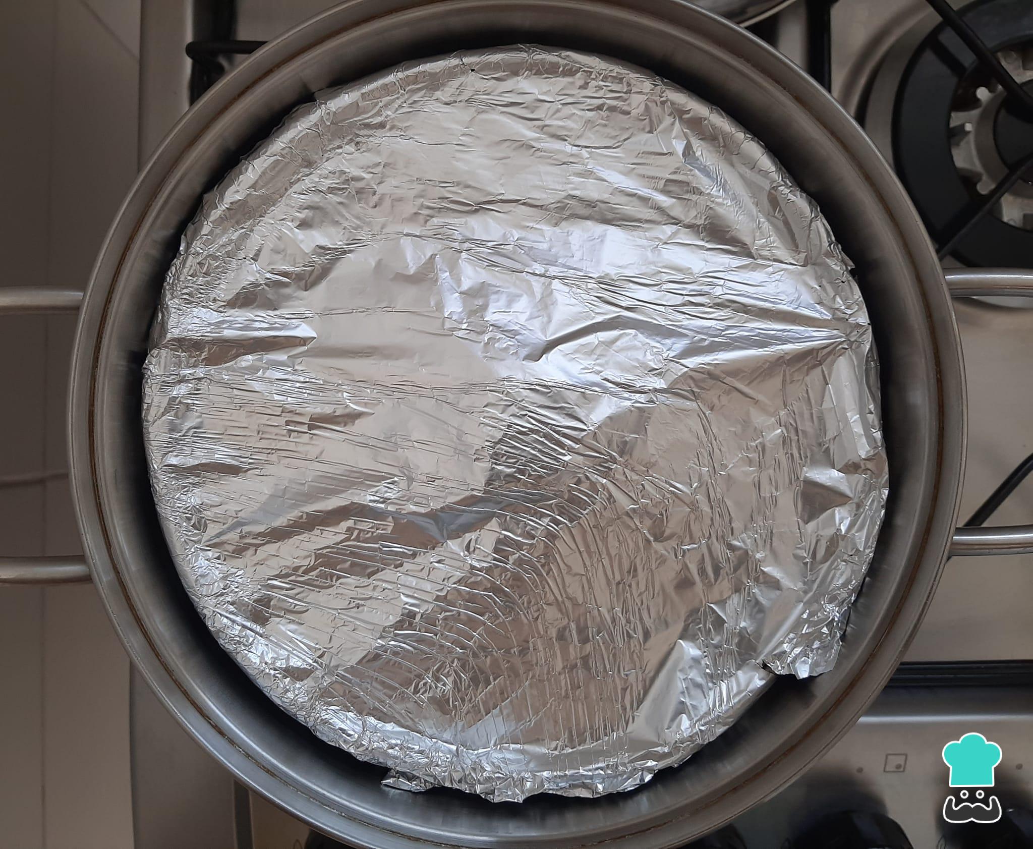 Cubra a forma com papel alumínio e acomode-a dentro de uma panela maior, com água (na altura de 3 dedos no máximo), para que o brigadeirão cozinhe em banho maria.