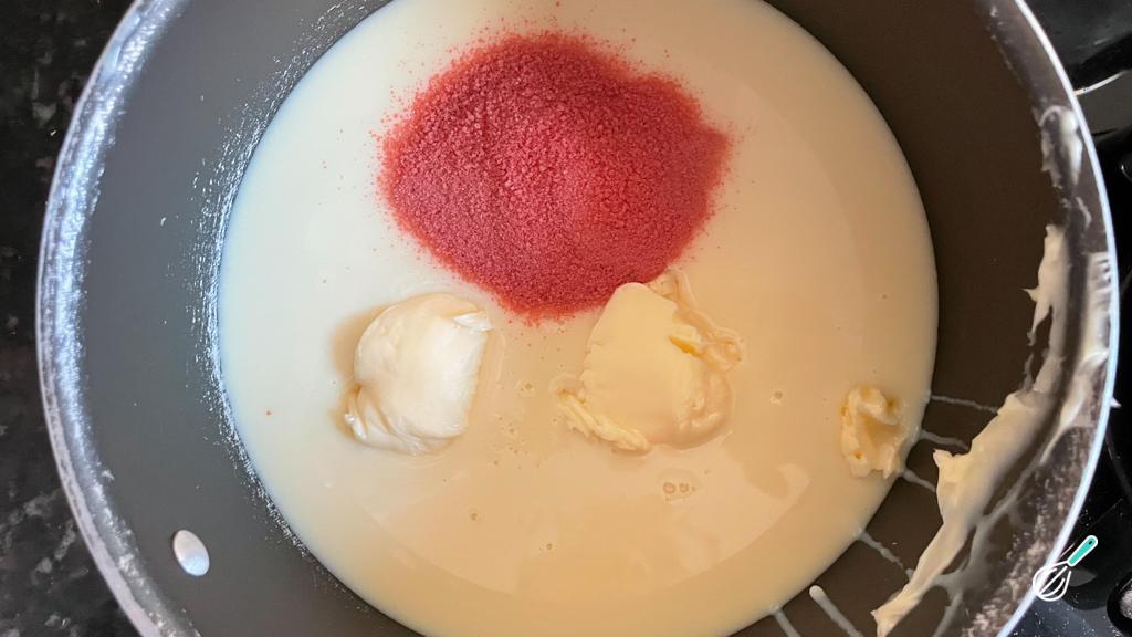 Numa panela com o fogo desligado, adicione o leite condensado, as 2 colheres de sopa de margarina, o creme de leite e a gelatina.