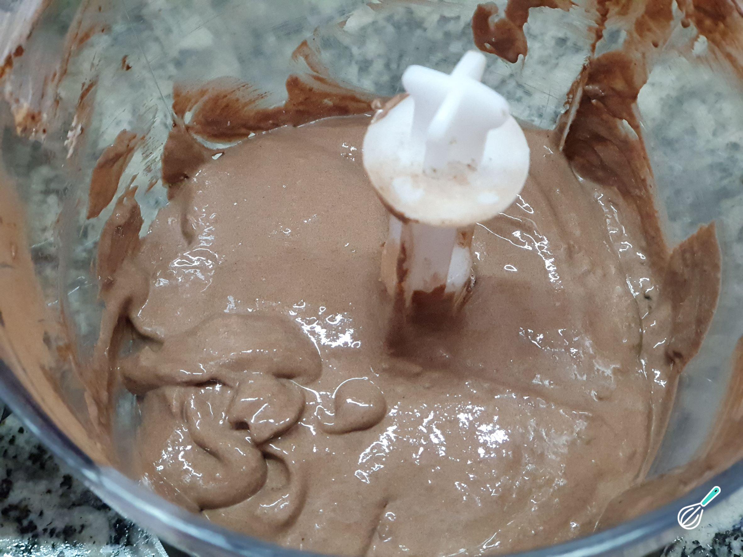Pique a casca da banana e adicione em um mixer junto com o creme de leite e o chocolate em pó. Bata muito bem.