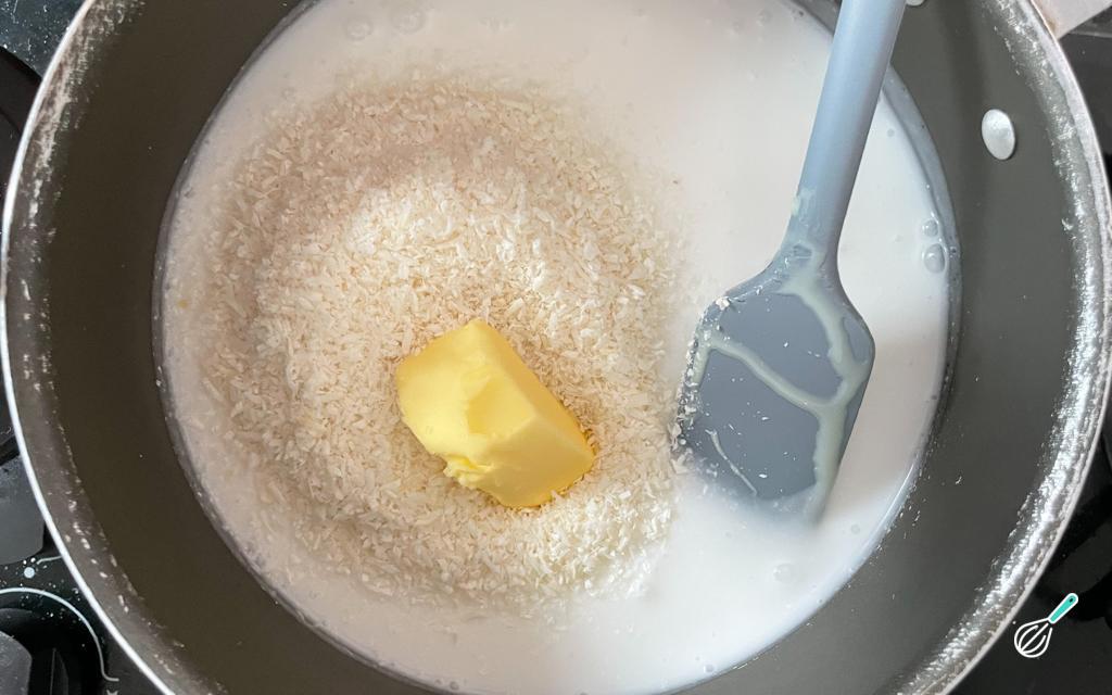 Numa panela com o fogo desligado, adicione o leite condensado, o leite de coco, o coco ralado e a manteiga.