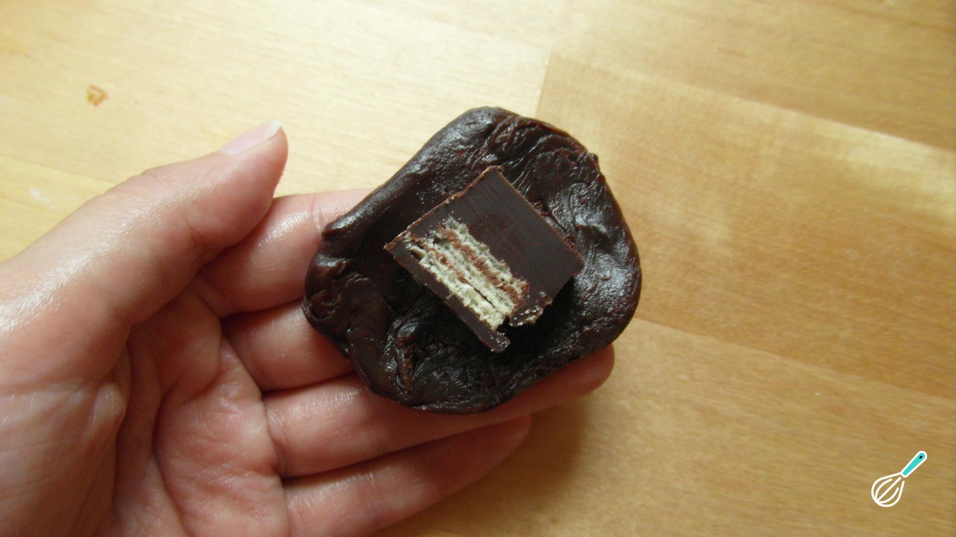 Com as mãos untadas, comece modelando o brigadeiro de Kit Kat: retire pedaços de brigadeiro, abra e coloque ao centro um quadrinho de Kit Kat. Feche e forme uma bolinha.