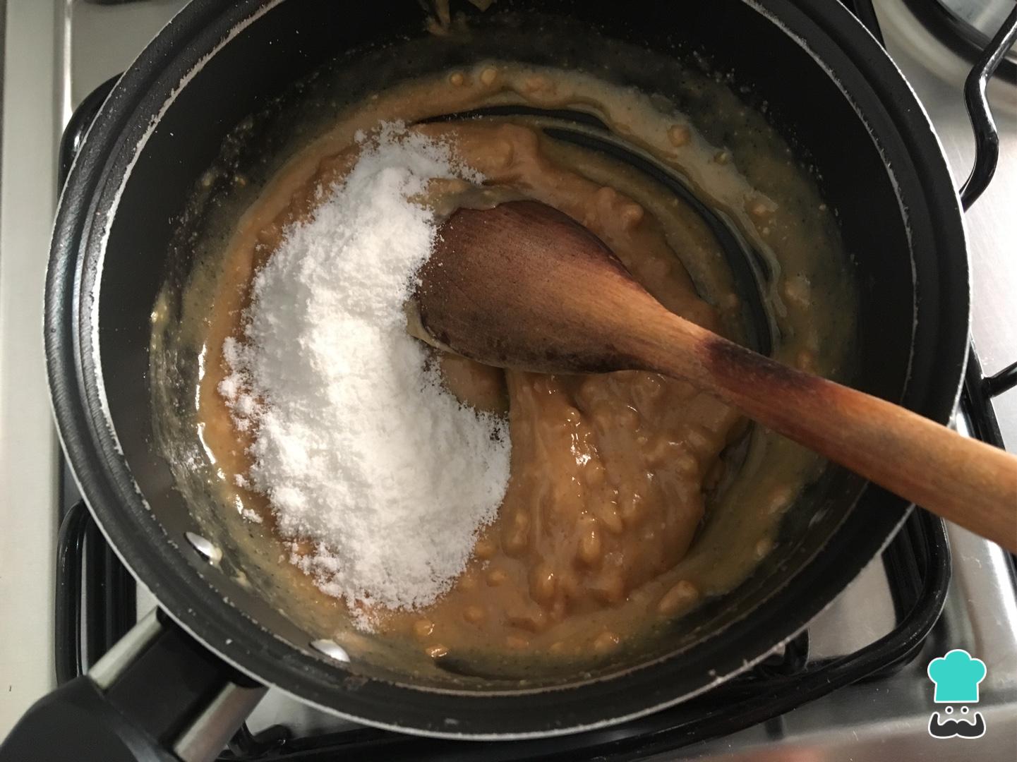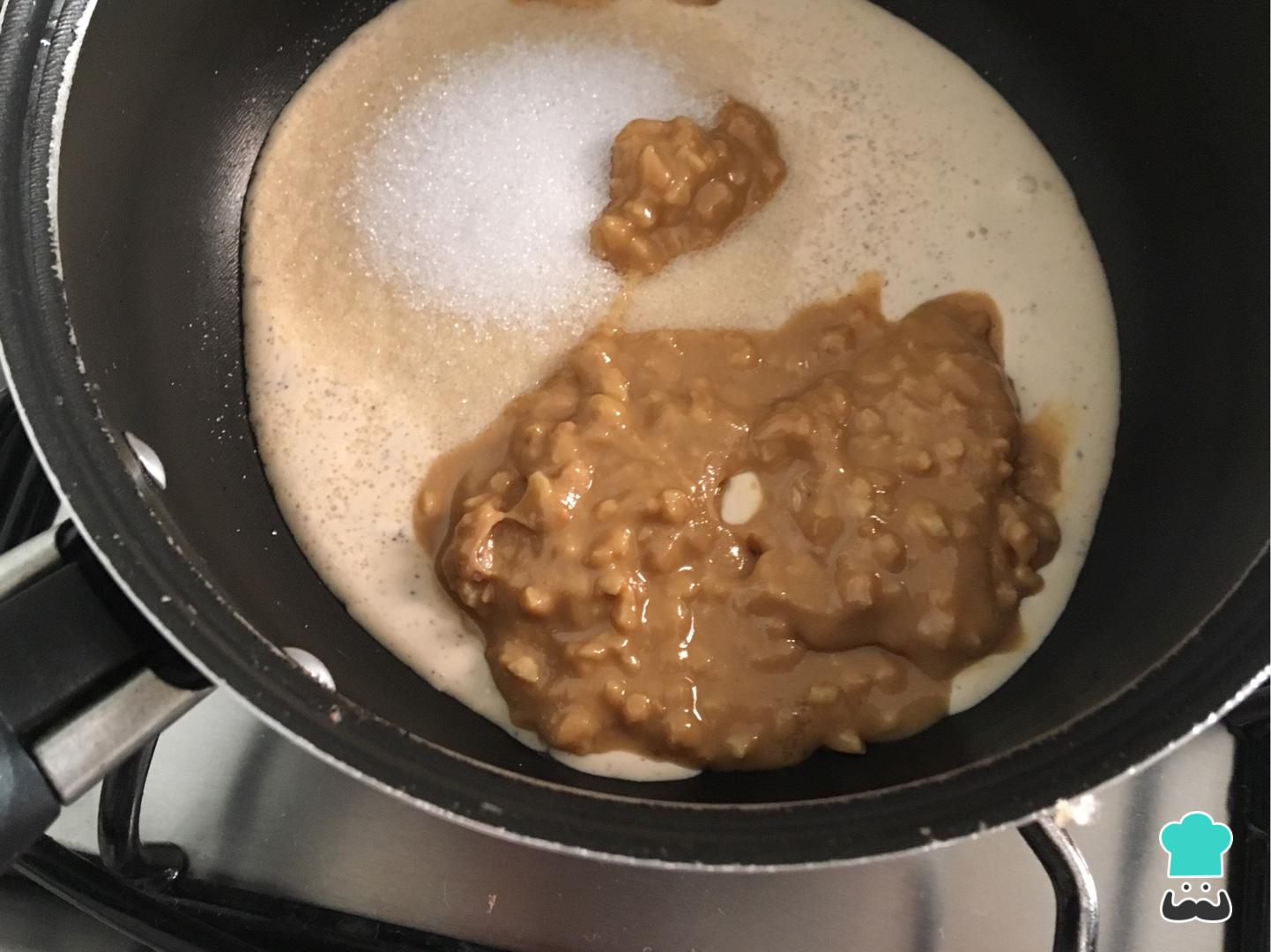Em uma panela junte o creme de leite, a pasta de amendoim e o xylitol ou adoçante em pó. Leve ao fogo baixo e misture bem.