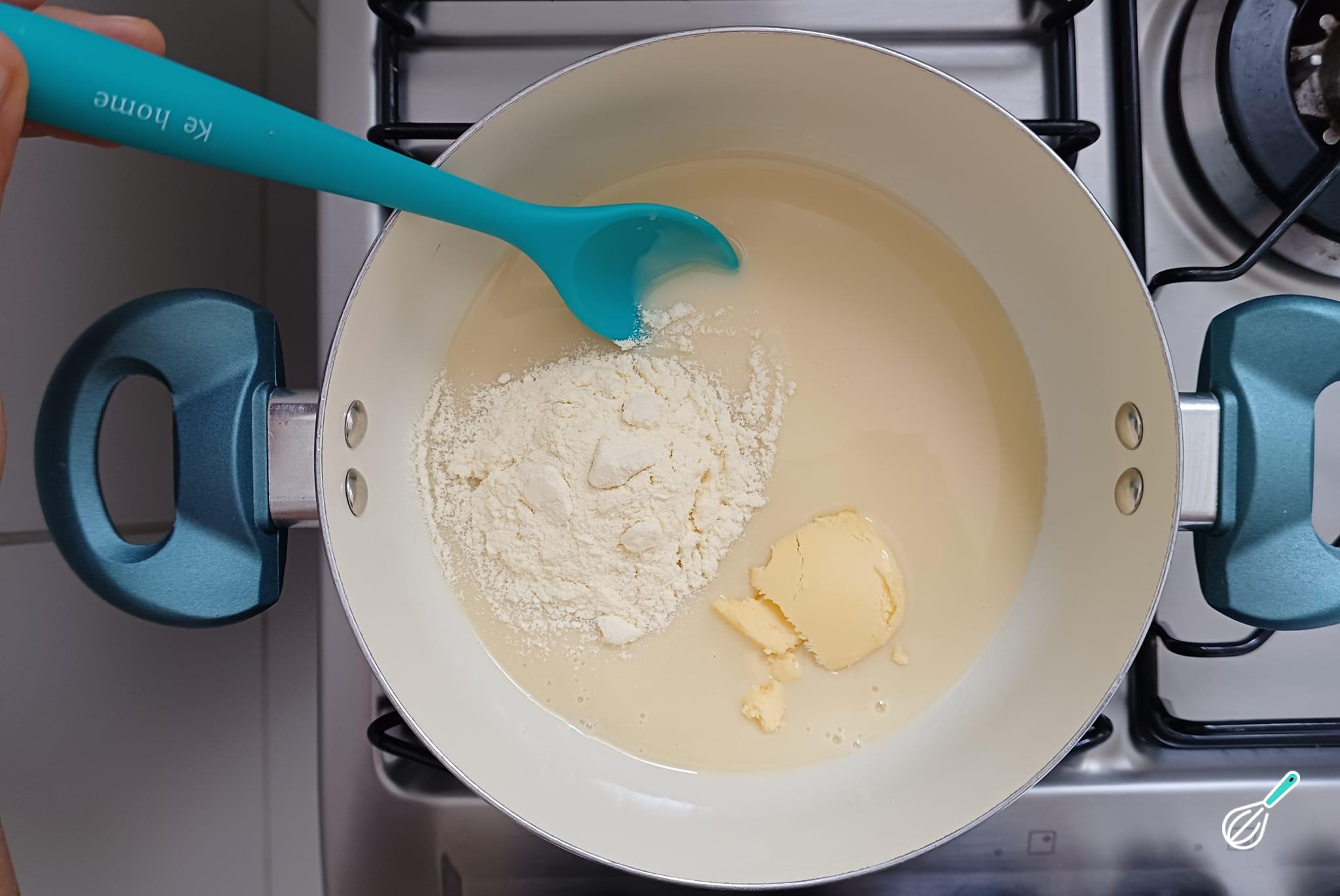 Numa panela, com o fogo desligado, junte o leite condensado, a manteiga e o leite em pó, misturando bem.