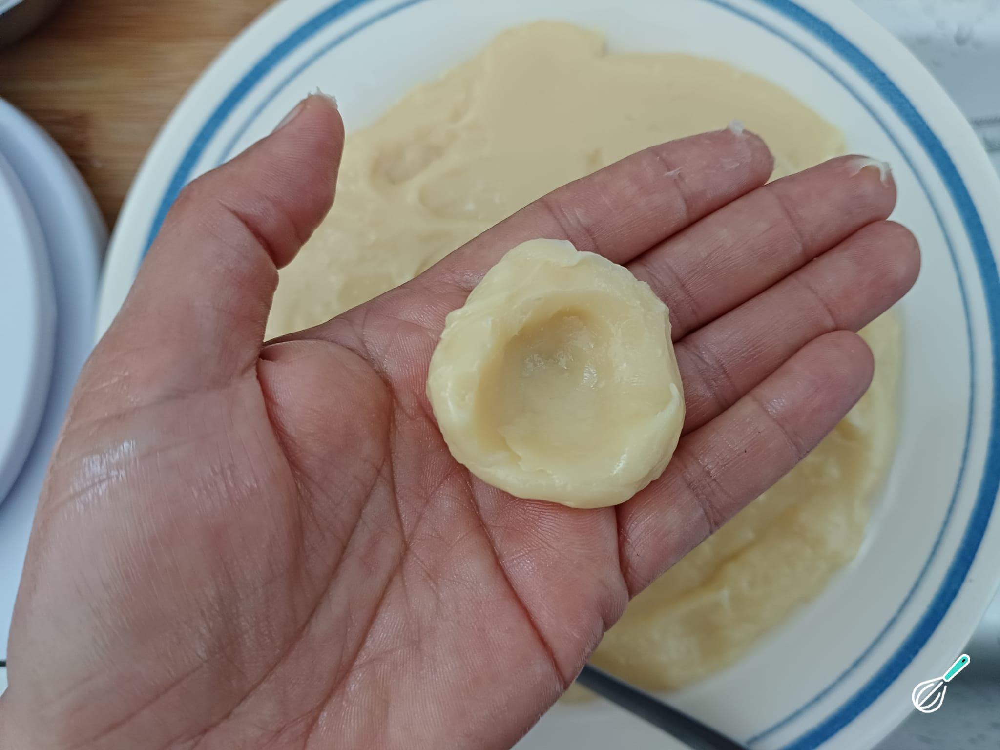 Quando o brigadeiro estiver frio, pegue pequenas porções (cerca de 14 gramas cada) e modele bolinhas, abra o centro formando uma cavidade.