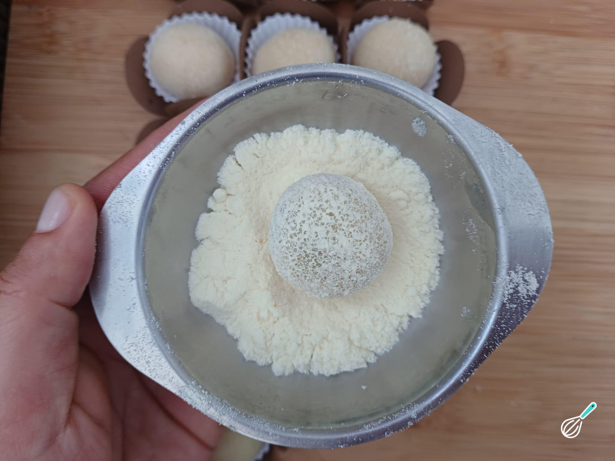 Passe os brigadeiros no leite em pó ou em açúcar cristal.