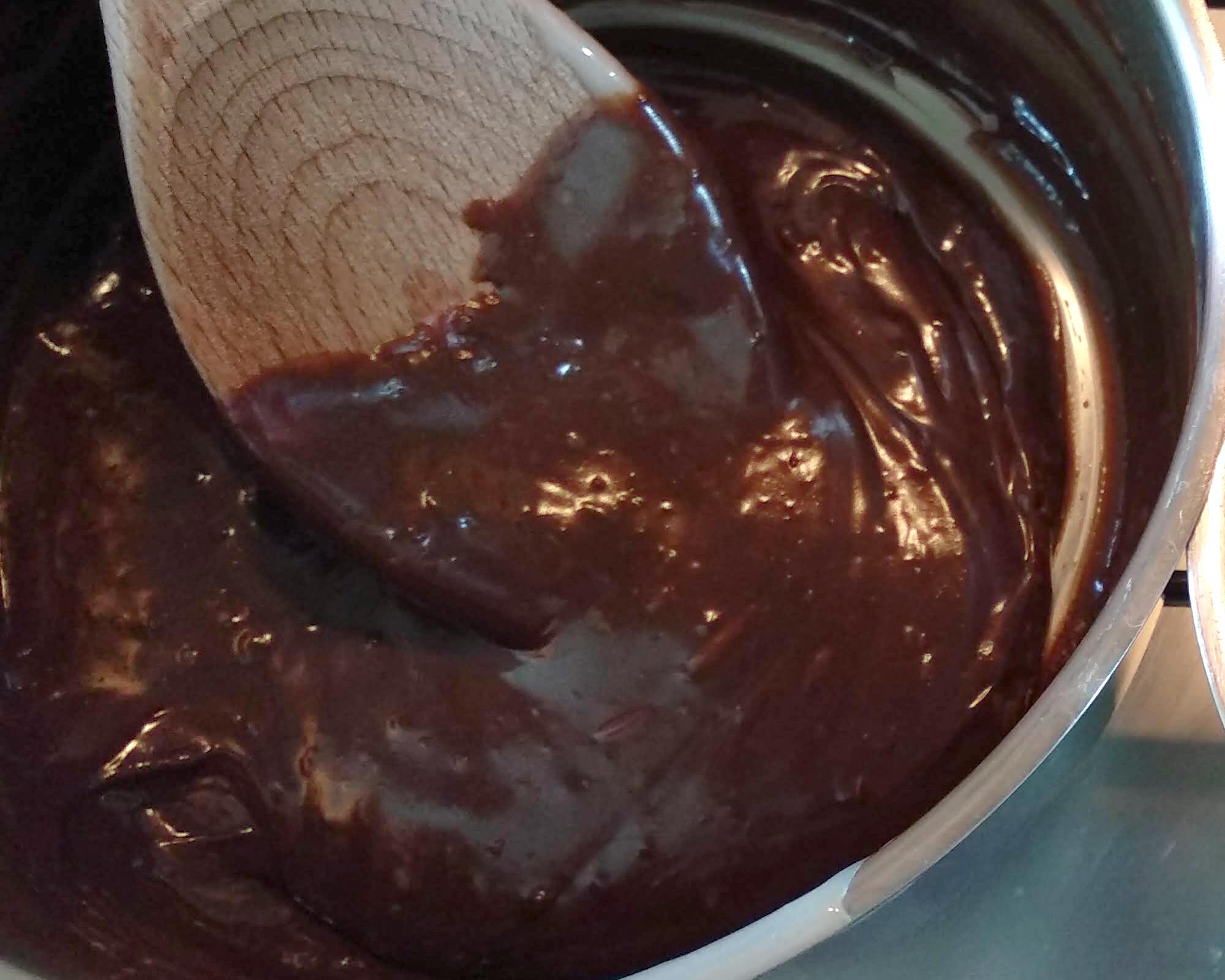 Dissolva o café solúvel na água quente e coloque na panela. Junte também o chocolate picado e leve ao fogo médio para abaixo. Fique mexendo por 20 minutos ou até desgrudar da panela.