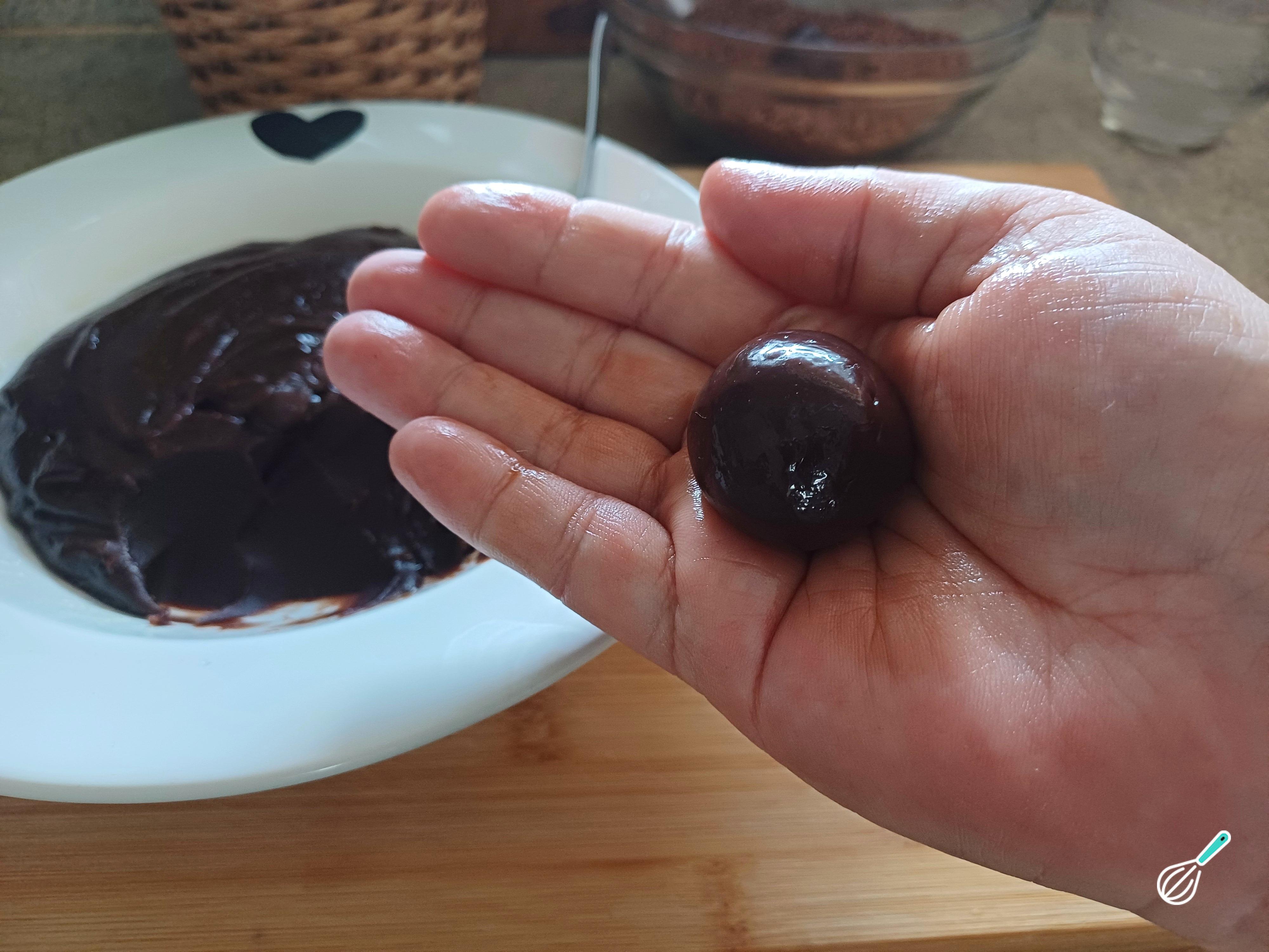Depois de esfriar, unte as mãos com um pouco de manteiga ou com água, faça pequenas bolinhas com a massa, em média 15 gramas cada uma.