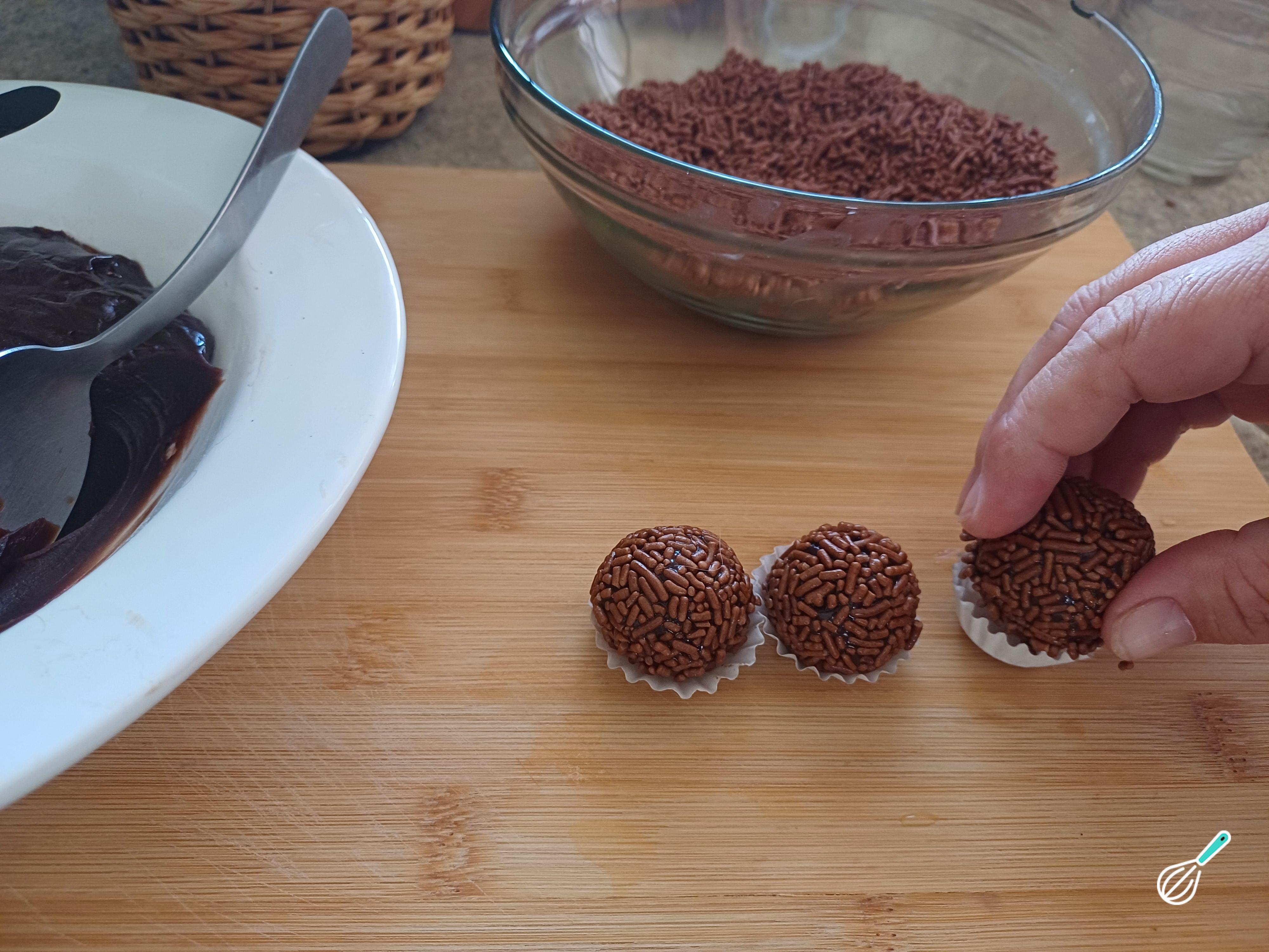 Em seguida, passe as bolinhas de brigadeiro nos confeitos de sua escolha, como granulado de chocolate, coco ralado ou outros. Coloque-os em forminhas de papel e estão prontos para servir.