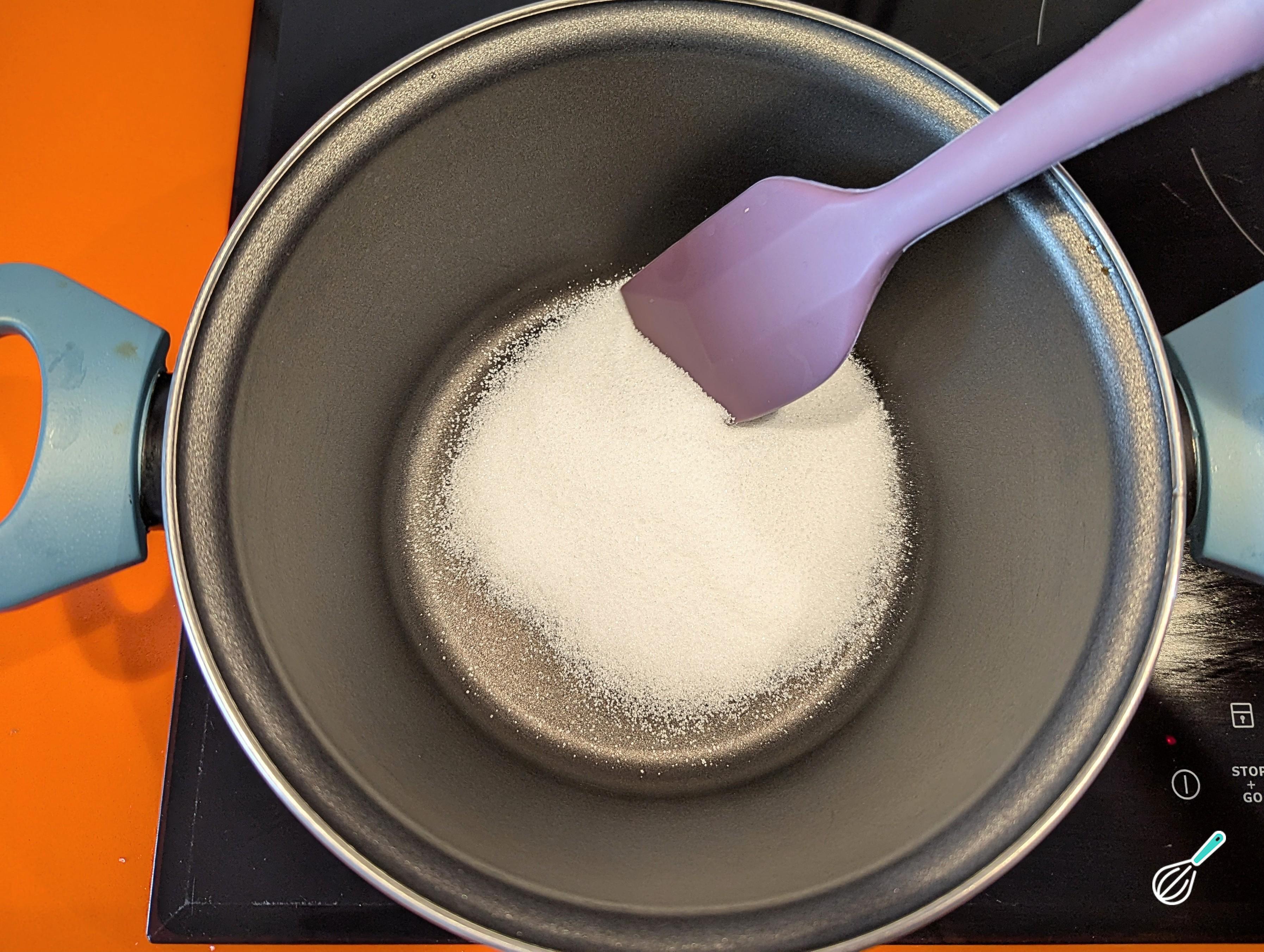 Em uma panela média, adicione o açúcar cristal e leve ao fogo médio. Mexa ocasionalmente até que derreta e atinja a coloração de caramelo dourado claro.