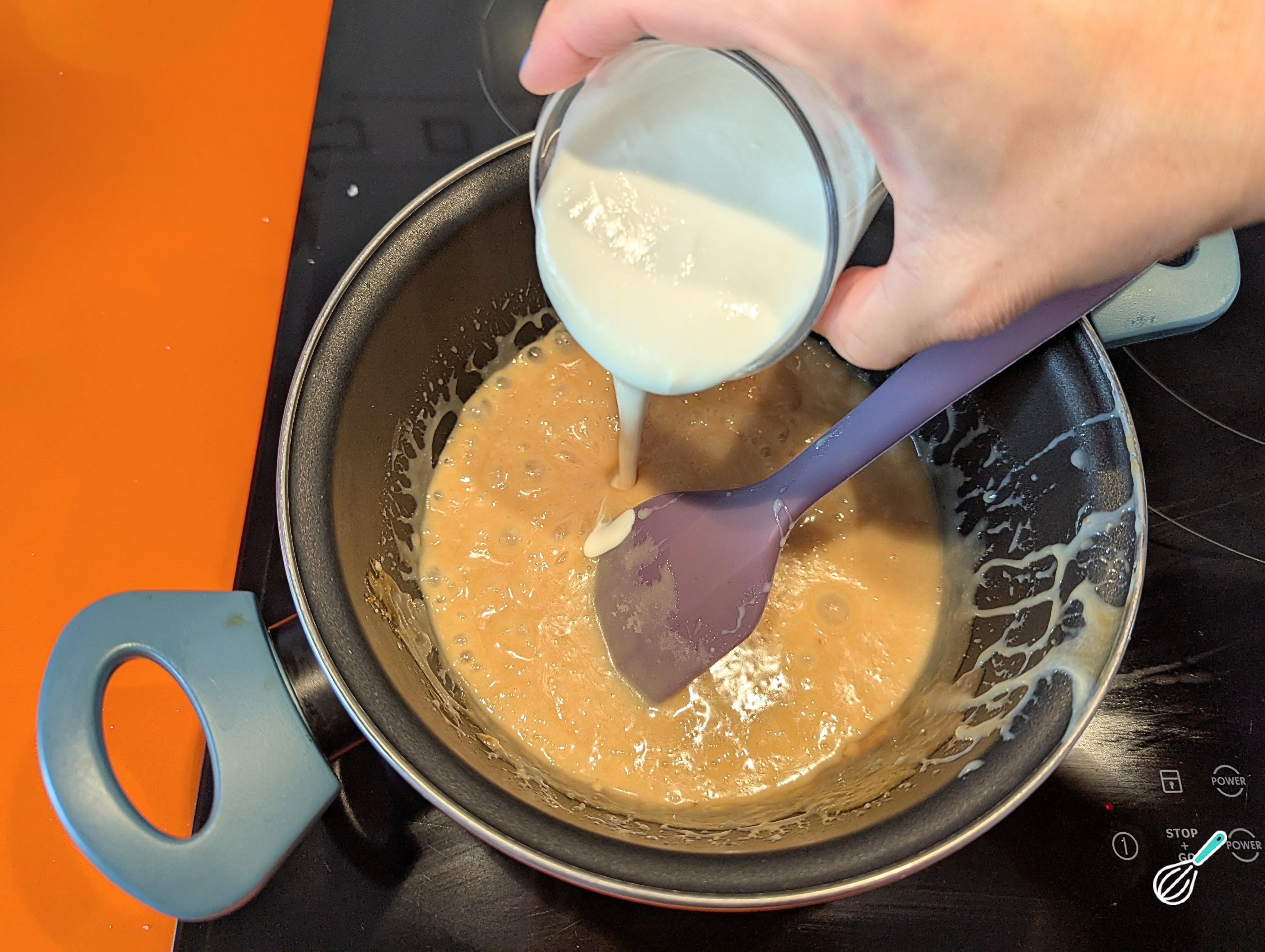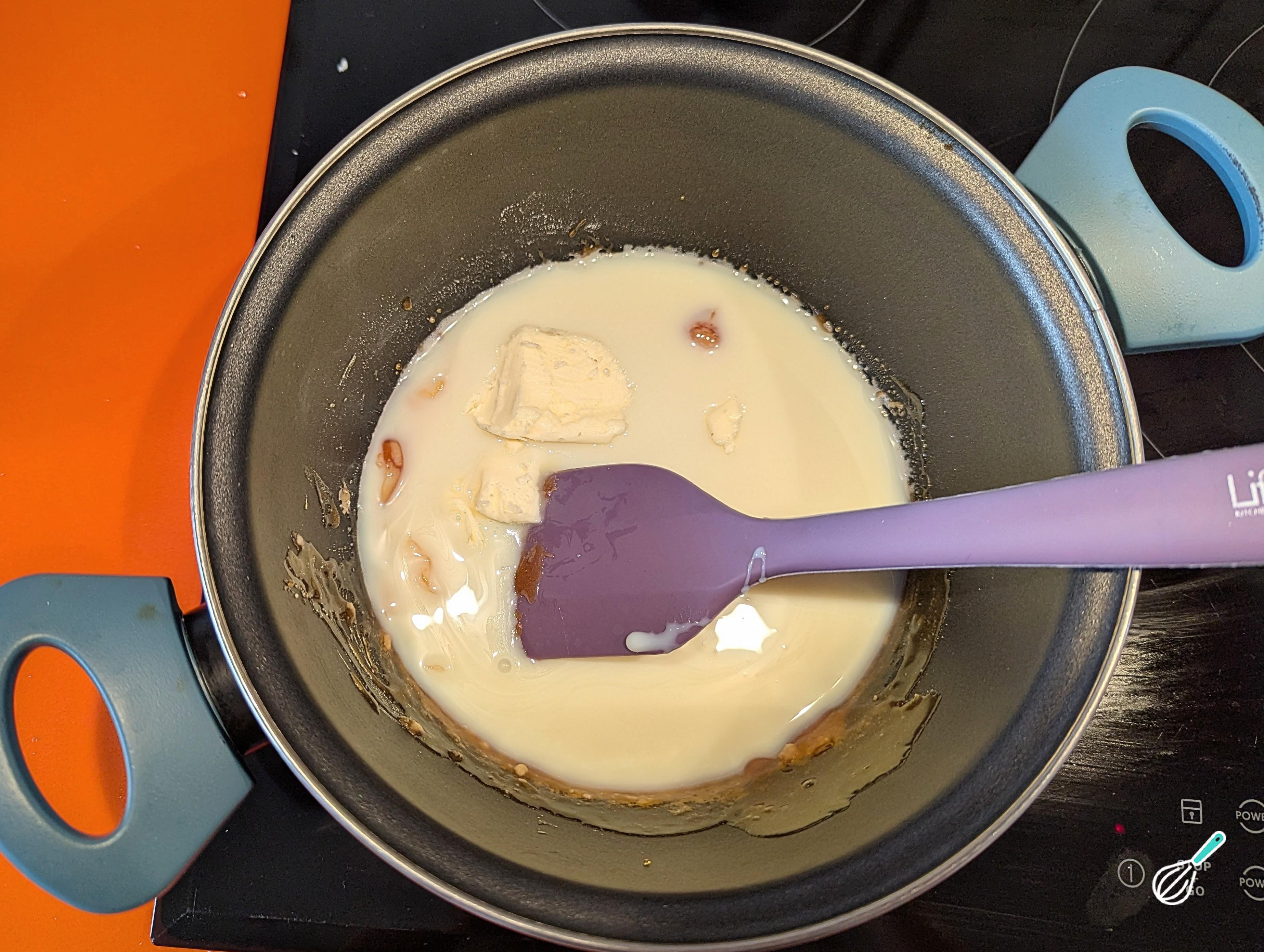Cuidadosamente, acrescente o leite condensado e a manteiga à panela. Misture bem até que o caramelo se dissolva completamente.