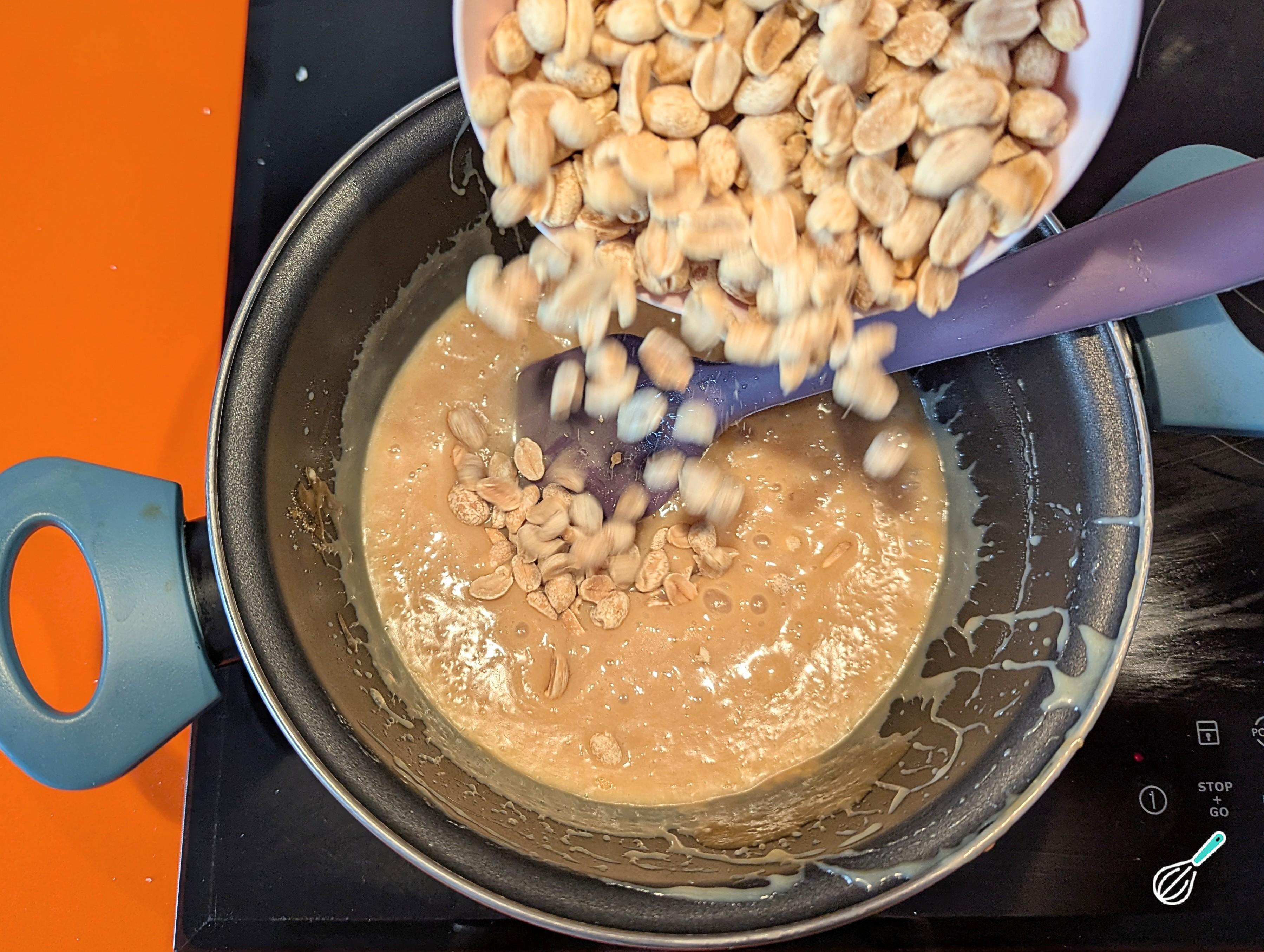 Adicione o amendoim torrado e continue mexendo em fogo baixo, sem parar, com cuidado para não queimar no fundo da panela.