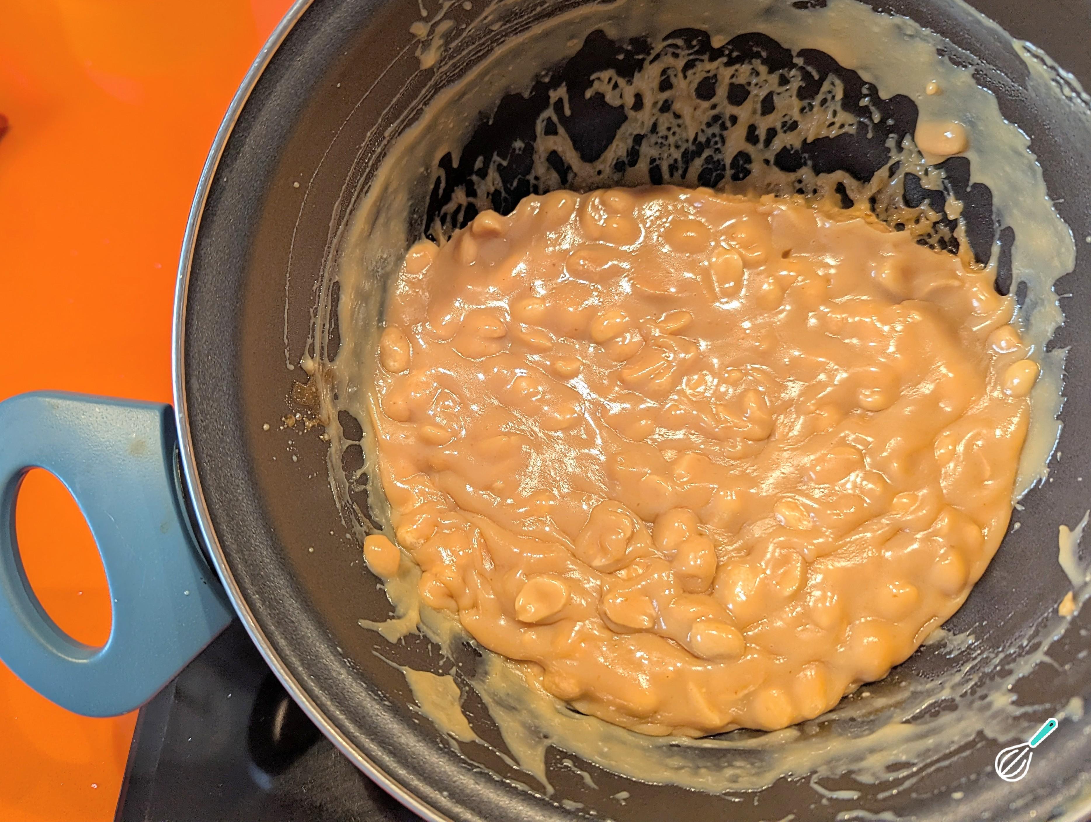 Dica: Atenção nessa etapa, a mistura pode borbulhar. É possível que o caramelo fique duro e forme blocos, mas não pense que deu errado, logo vai se dissolvendo e fica uma mistura homogênea.