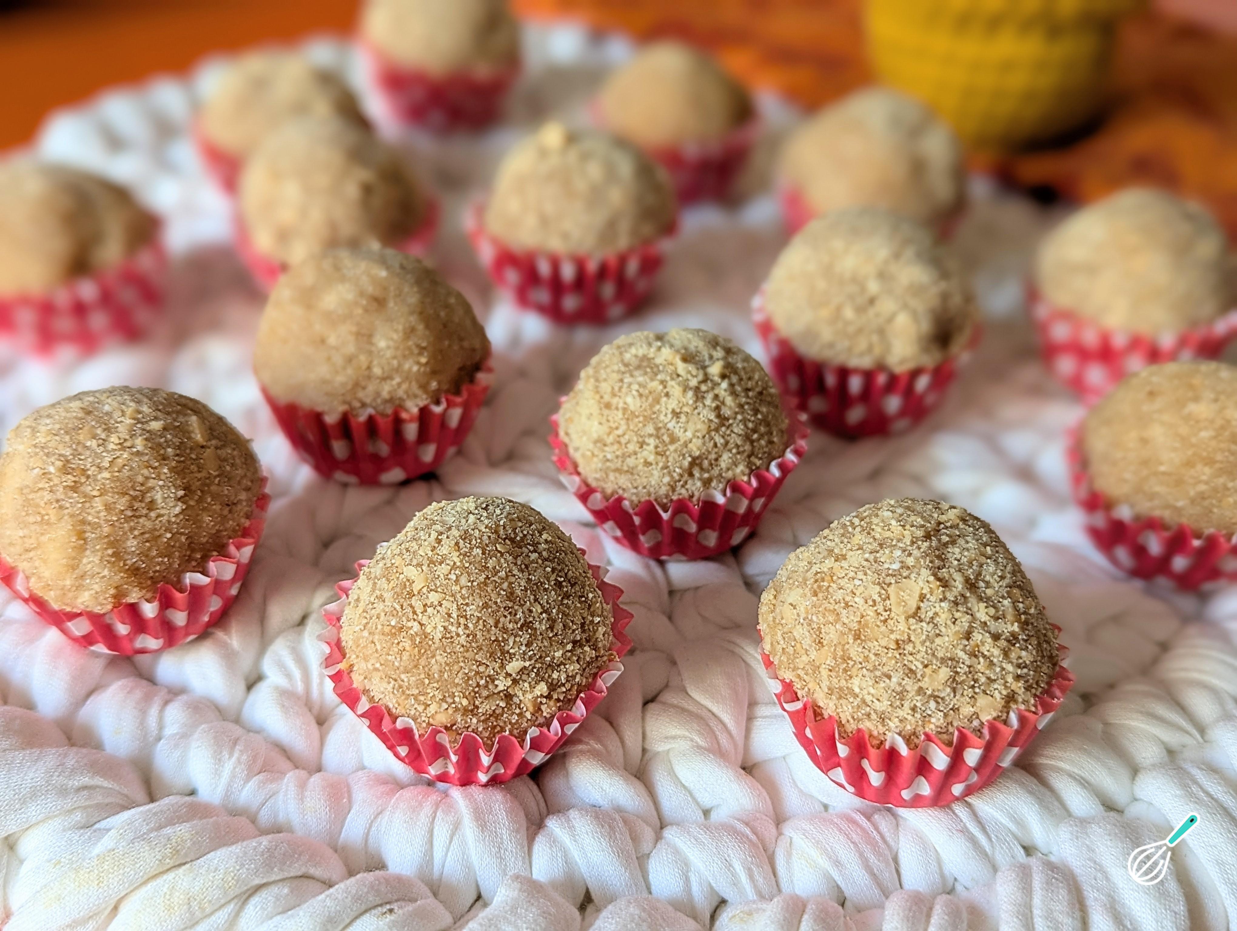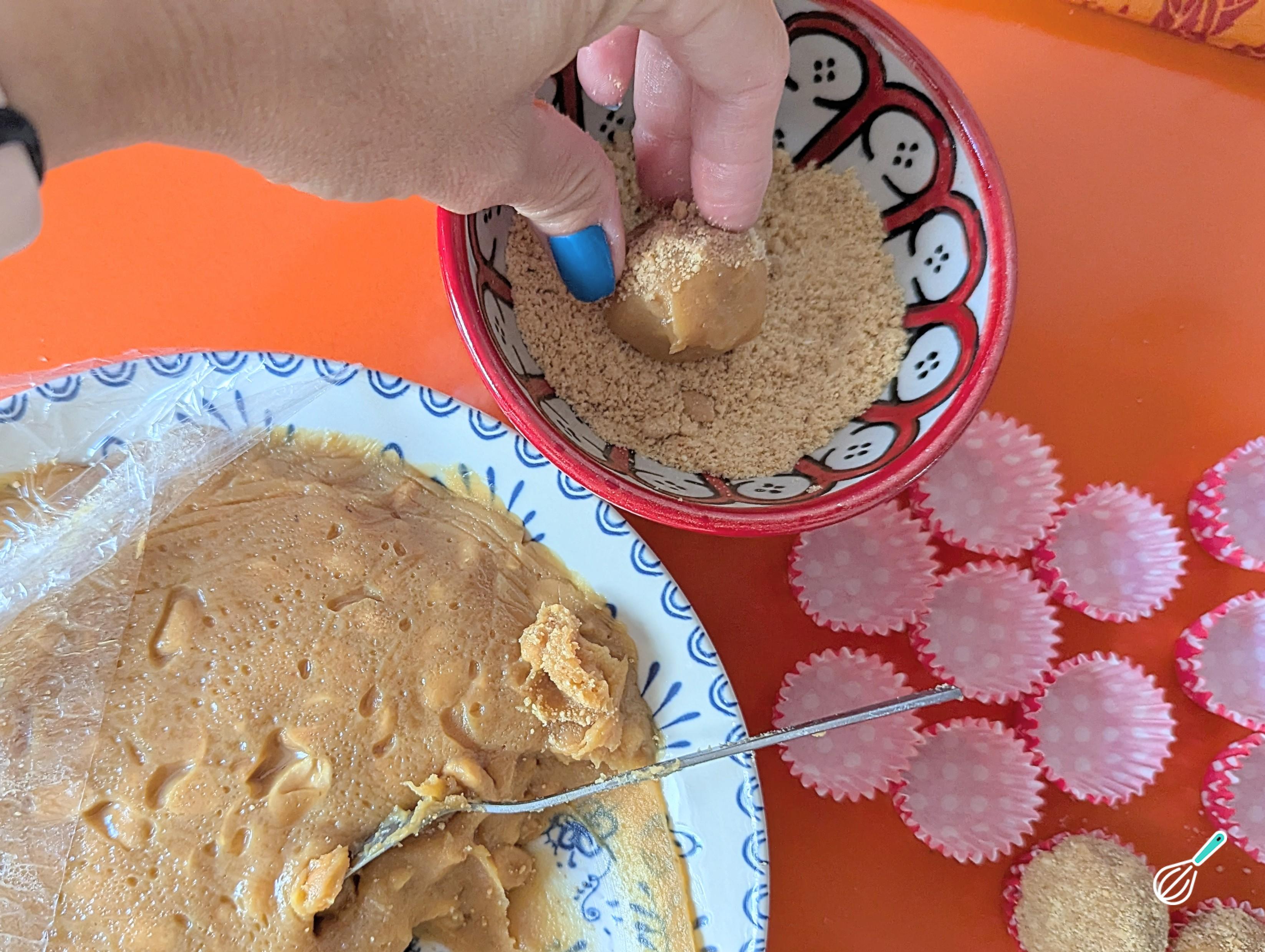 Modele as bolinhas com as mãos untada de manteiga, passe-as no açúcar cristal ou se preferir, no amendoim triturado, para dar um charme extra e realçar o sabor.