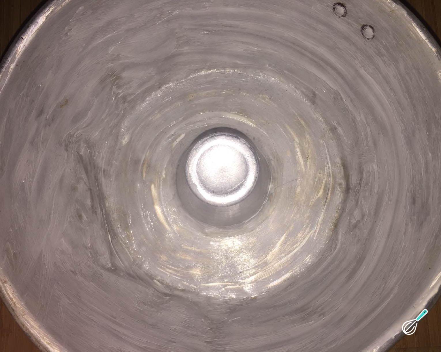 Pré-aqueça o forno nos 180ºC e, enquanto isso, unte com manteiga ou óleo uma forma redonda de tamanho médio (20 a 22 cm). Polvilhe trigo ou fubá em toda a forma.