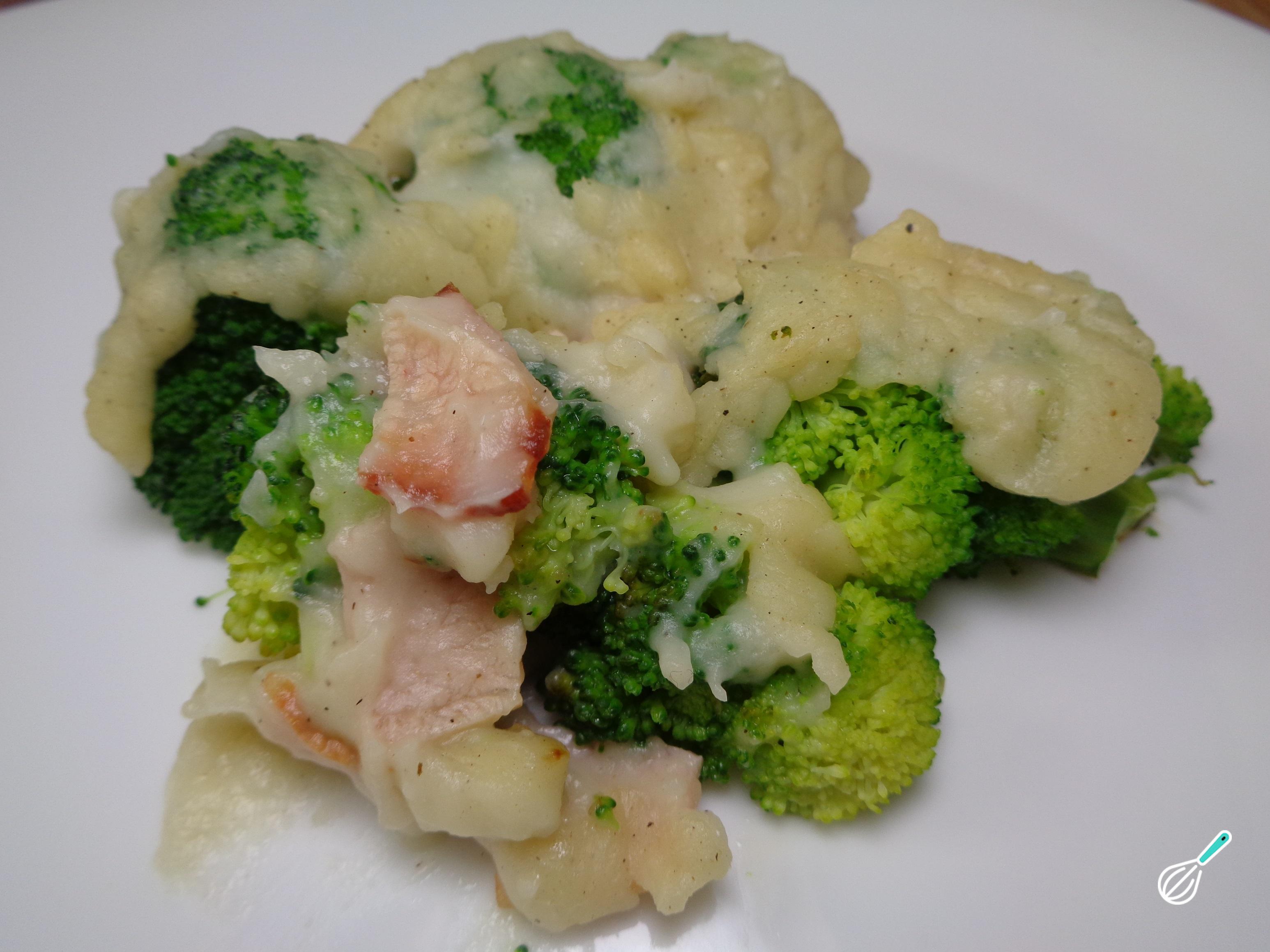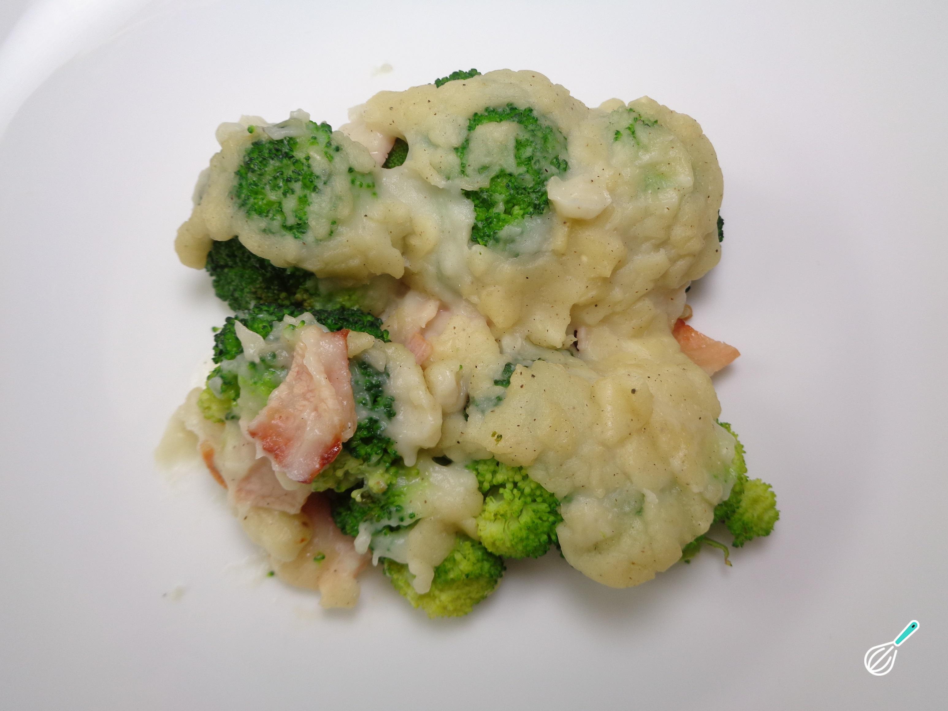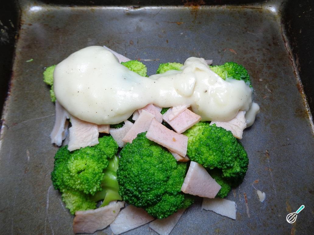 Agora, coloque os brócolis cozidos em um refratário próprio de ir ao forno, junte uns pedaços de presunto ibérico e termine banhando todos os ingredientes com o molho branco. Leve ao forno por aproximadamente 10 minutos a 200ºC.