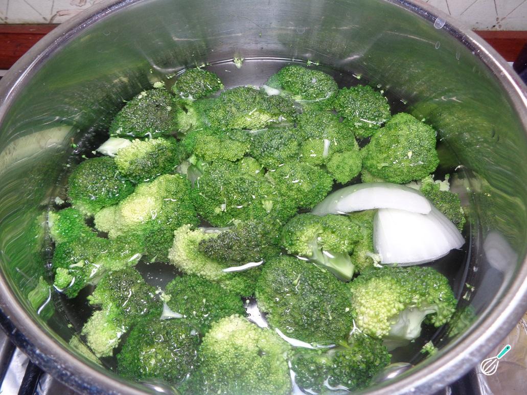 Para começar, pegue nos pedaços de brócolis e lave perfeitamente. De seguida coloque-os em uma panela com água a ferver, tempere com uma pitada de sal e a metade da cebola. Deixe que coza até os brócolis estarem suaves mas crocantes. O tempo de cozedura é aproximadamente de uns seis minutos. Uma vez prontos retire do fogo, escorra a água e reserve um momento.