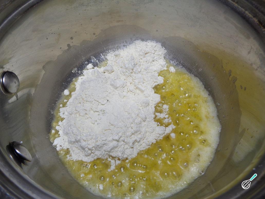Prepare agora o molho branco: para isso, pegue na manteiga e coloque para derreter em uma panela. Uma vez, derretida, adicione as colheres de farina e misture rapidamente com a ajuda de um fouet, até que se integrem todos os ingredientes.