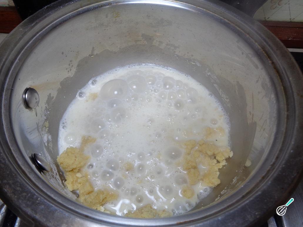Uma vez integrada a manteiga com a farinha, comece a juntar o leite aos poucos, sempre sem deixar de mexer.