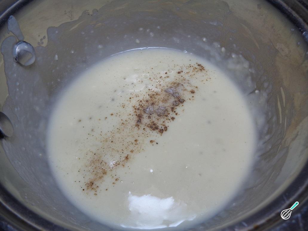 Passados uns minutos, tempere com uma pitada de sal e de pimenta do reino. Continue a mexer até que o molho fique espesso. Uma vez pronto o molho branco, retire do fogo e reserve um momento.