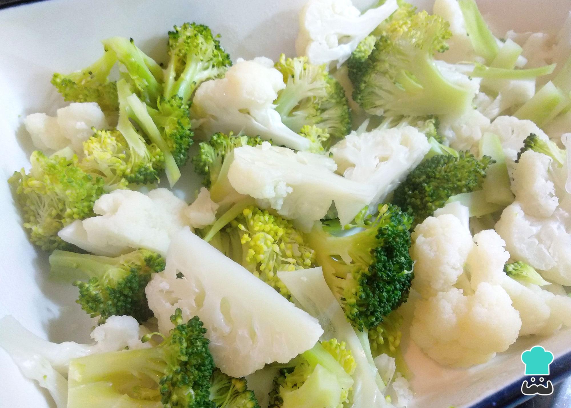 Leve ao fogo uma panela com a couve-flor, cubra com água, adicione um pouco de sal e deixe ferver por 5 minutos. Nesse momento adicione o brócolis e cozinhe por mais 5 minutos.
