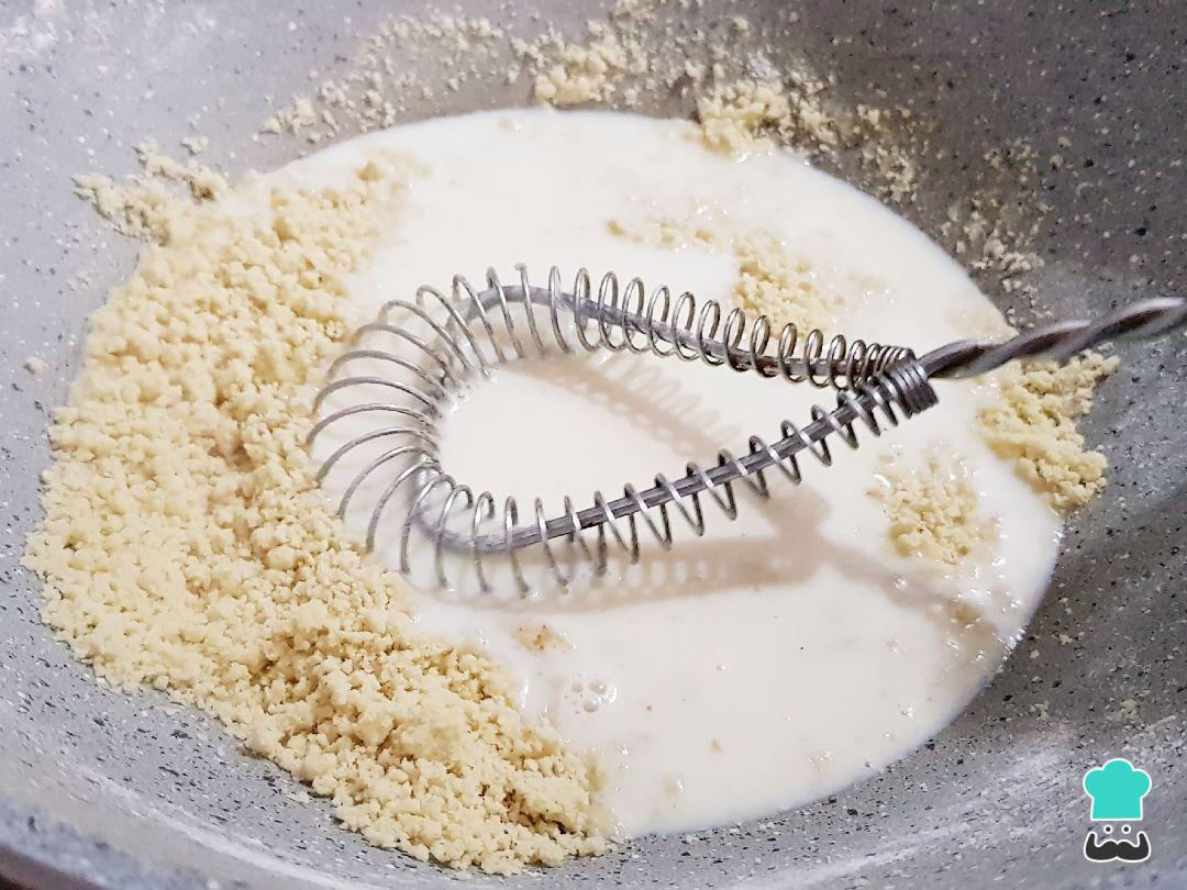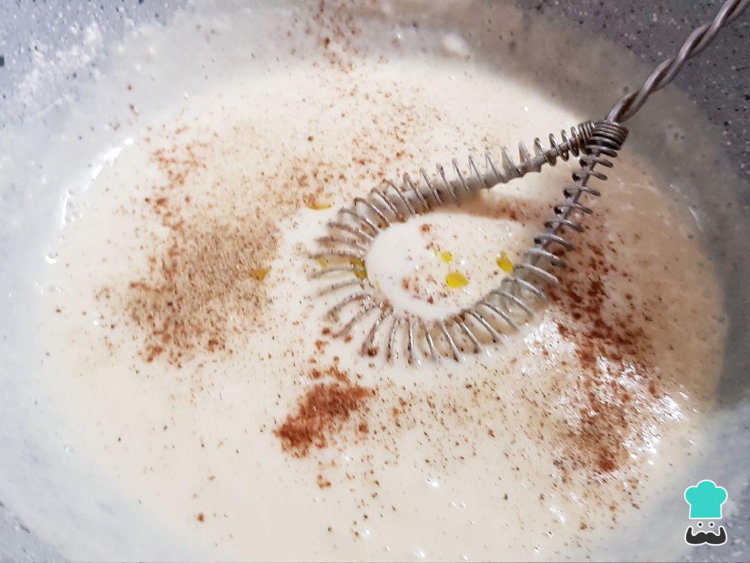 Fique mexendo até que os grumos de farinha se dissolvam completamente no líquido e ele vire um molho branco vegano consistente. Nesse momento tempere a gosto com noz moscada, pimenta e sal.
