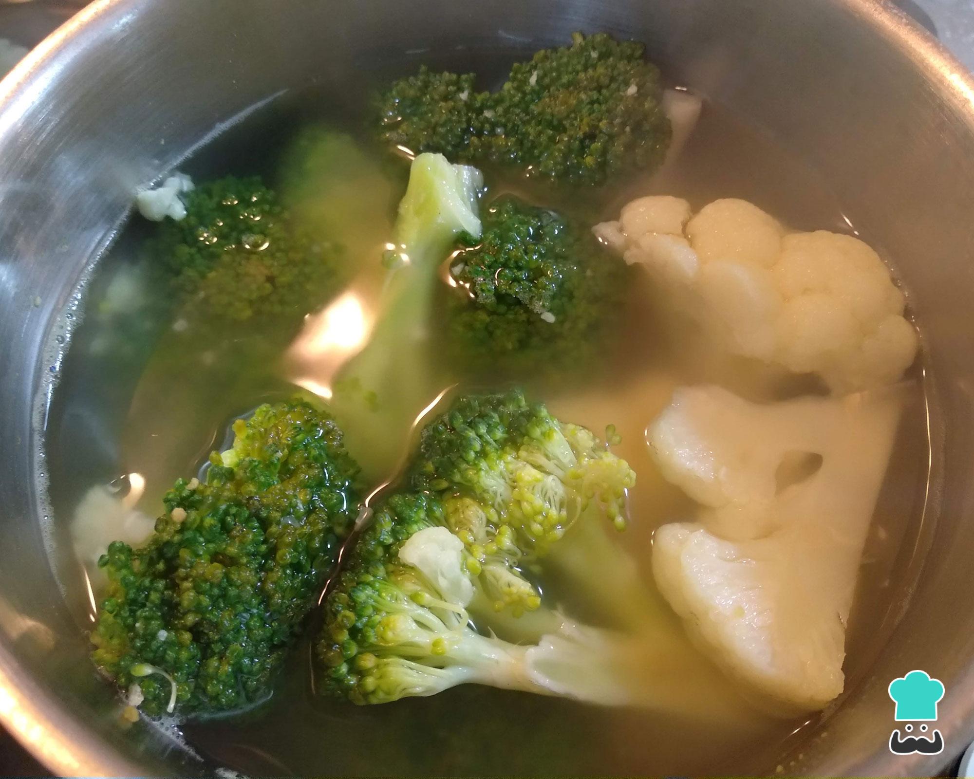 Coloque o brócolis e a couve flor numa panela e cubra com água. Adicione 1 pitada de sal e leve para cozinhar no fogo médio por 5 minutos após ferver.
