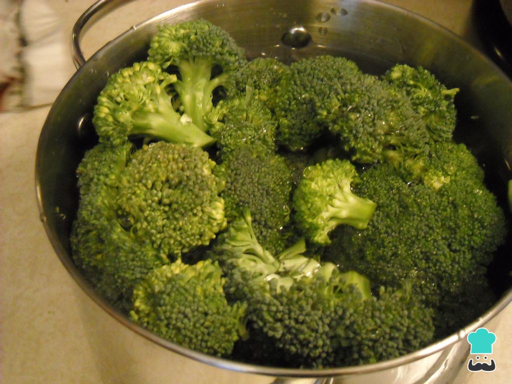 Coloque no fogo uma panela com água e sal. Quando ferver, adicione o brócolis (previamente lavados) e deixe ferver por 2 minutos. Escorra e passe por água fria para interromper o cozimento.