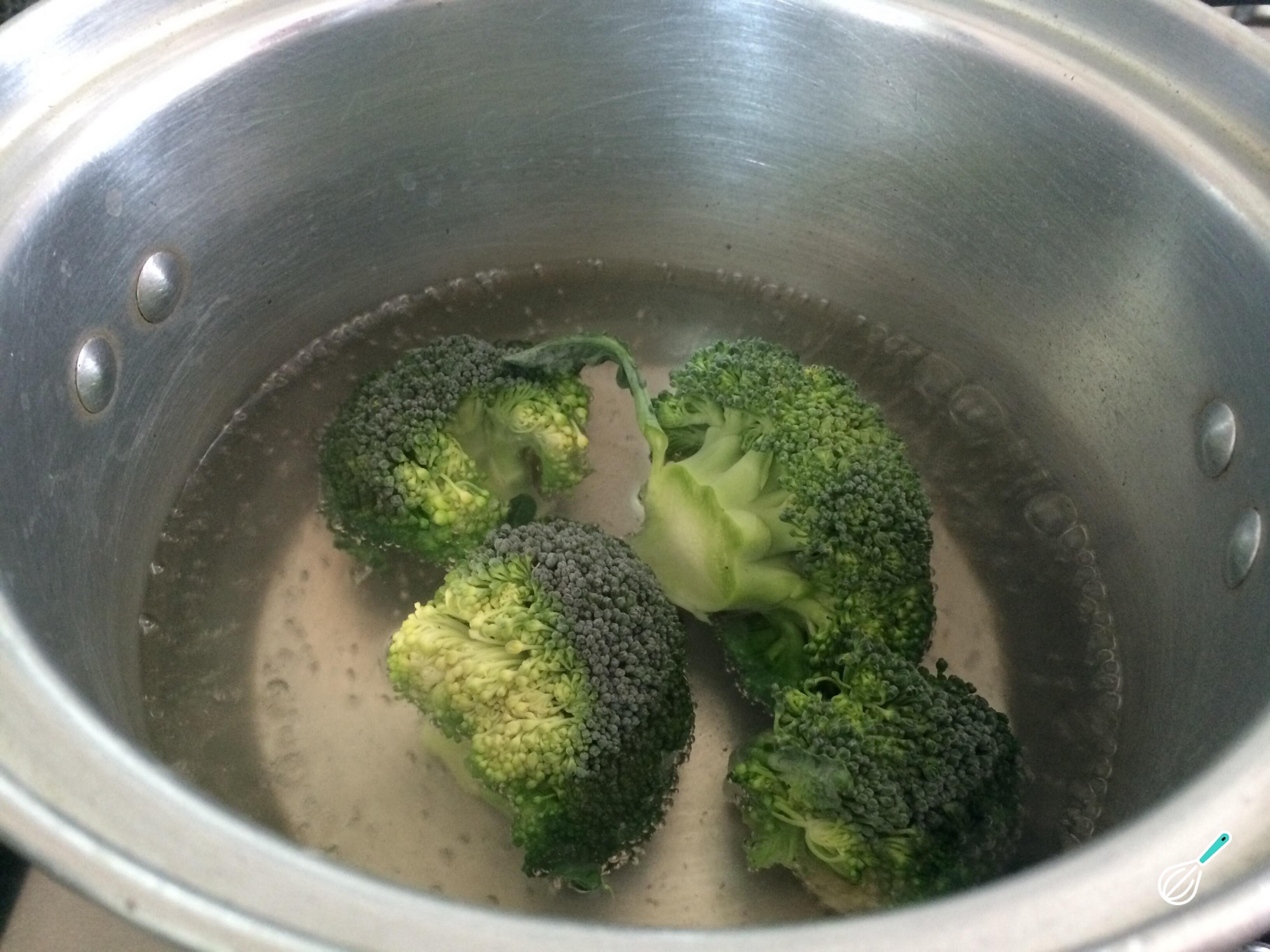 Em uma panela em fogo alto com água fervente e uma pitada de sal cozinhe o brócolis cortado em pedaços. Bastarão 5 minutos depois da água começar fervendo, pois o legume terminará de cozinhar no forno.