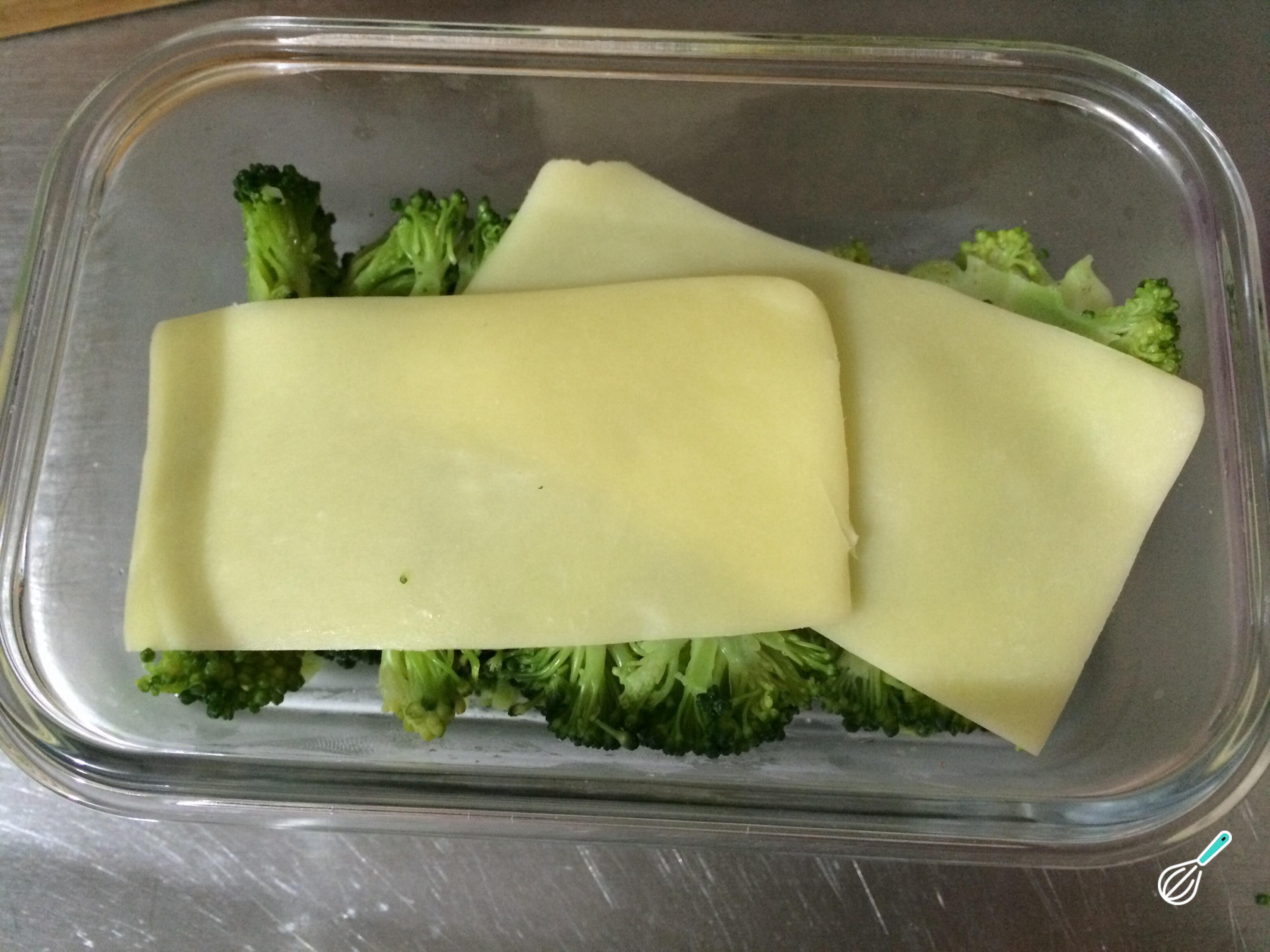 Acrescente as fatia de queijo sobre o brócolis e leve a assar no forno preaquecido a 180ºC até que o queijo derreta.